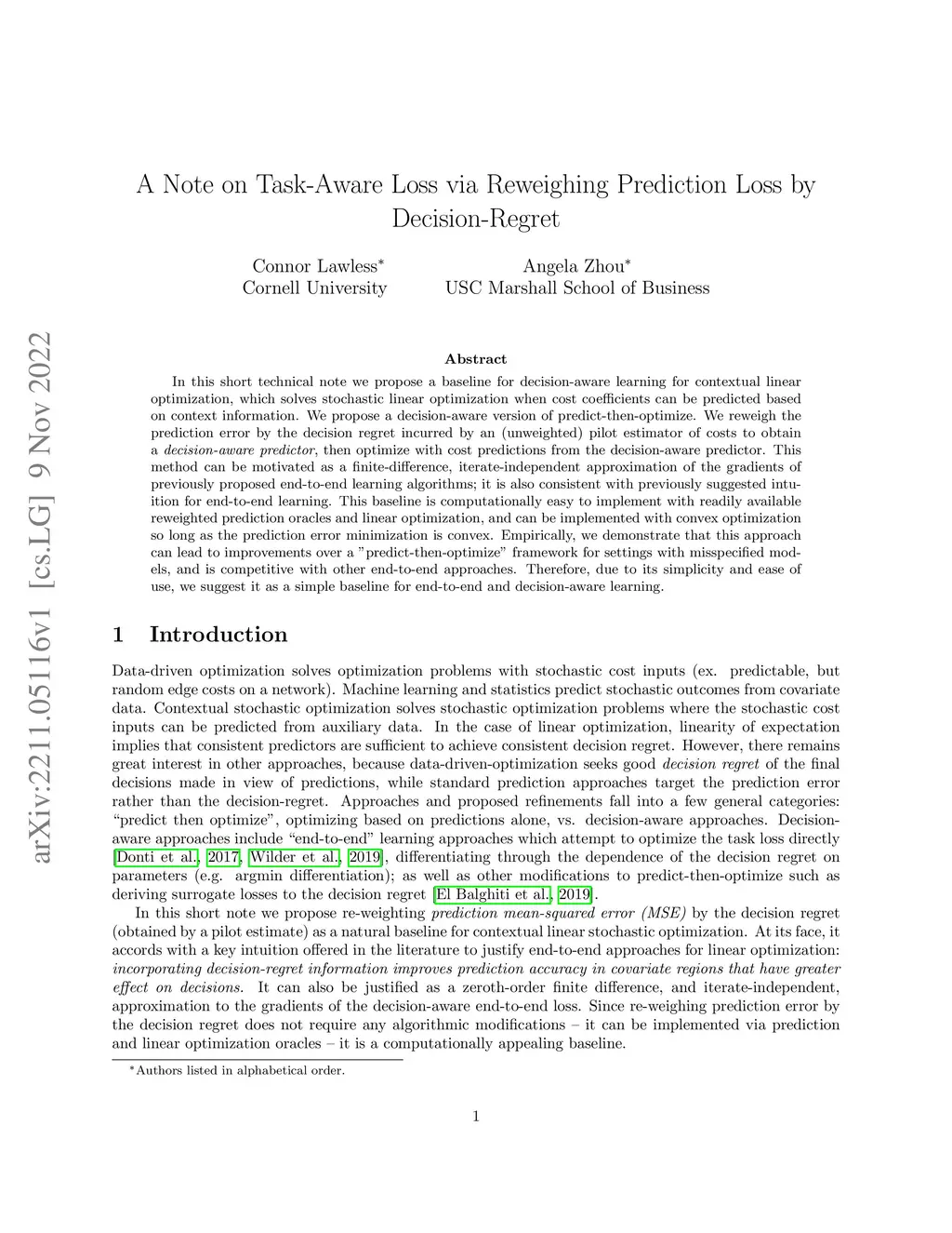 In this short technical note we propose a baseline for decision-aware learning for contextual linear optimization, which solves stochastic linear optimization when cost coefficients can be predicted based on context information. We propose a decision-aware version of predict-then-optimize. We reweigh the prediction error by the decision regret incurred by an (unweighted) pilot estimator of costs to obtain a decision-aware predictor, then optimize with cost predictions from the decision-aware predictor. This method can be motivated as a finite-difference, iterate-independent approximation of the gradients of previously proposed end-to-end learning algorithms; it is also consistent with previously suggested intuition for end-to-end learning. This baseline is computationally easy to implement with readily available reweighted prediction oracles and linear optimization, and can be implemented with convex optimization so long as the prediction error minimization is convex. Empirically, we demonstrate that this approach can lead to improvements over a "predict-then-optimize" framework for settings with misspecified models, and is competitive with other end-to-end approaches. Therefore, due to its simplicity and ease of use, we suggest it as a simple baseline for end-to-end and decision-aware learning.