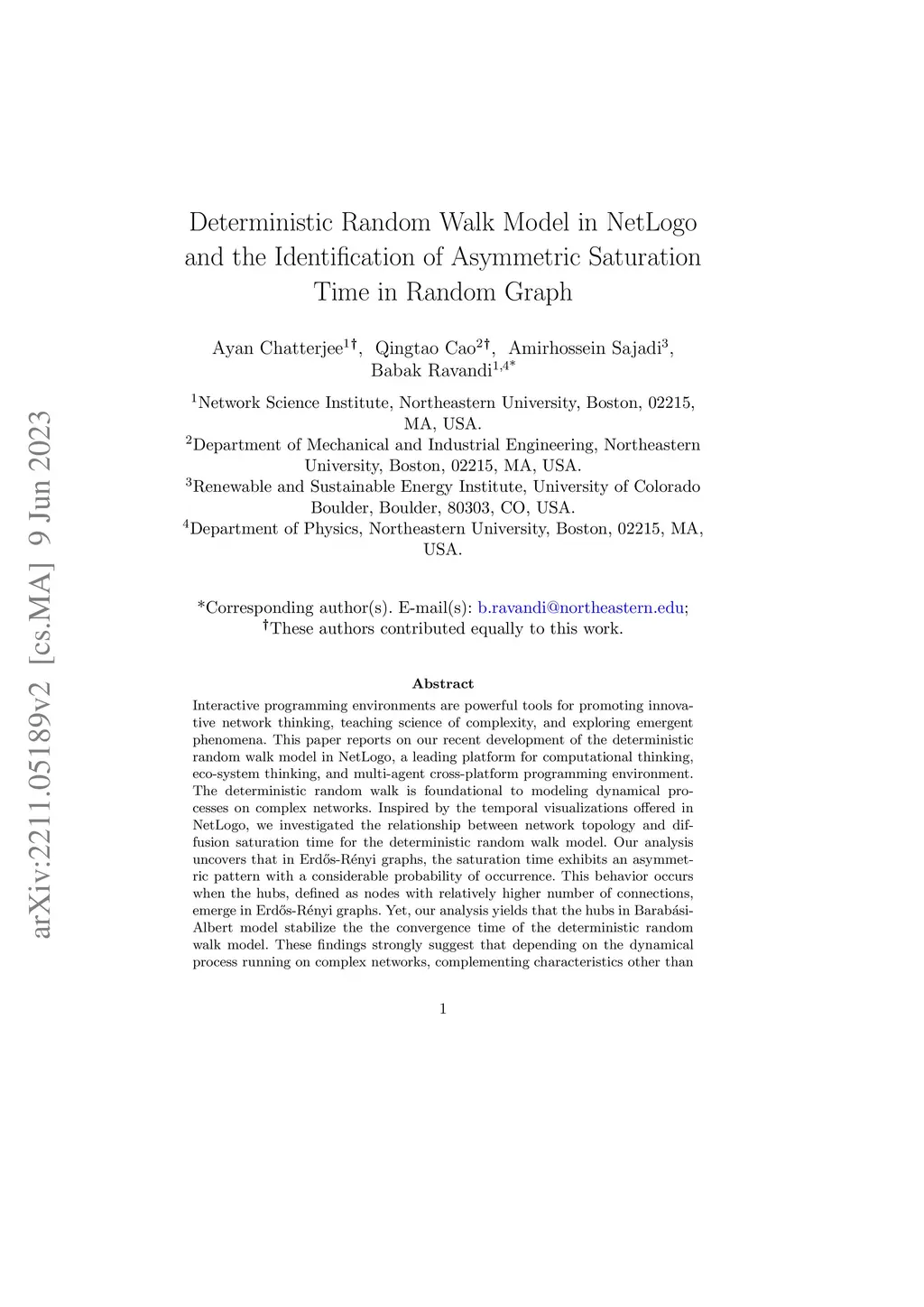 Interactive programming environments are powerful tools for promoting innovative network thinking, teaching science of complexity, and exploring emergent phenomena. This paper reports on our recent development of the deterministic random walk model in NetLogo, a leading platform for computational thinking, eco-system thinking, and multi-agent cross-platform programming environment. The deterministic random walk is foundational to modeling dynamical processes on complex networks. Inspired by the temporal visualizations offered in NetLogo, we investigated the relationship between network topology and diffusion saturation time for the deterministic random walk model. Our analysis uncovers that in Erd\H{o}s-R\'{e}nyi graphs, the saturation time exhibits an asymmetric pattern with a considerable probability of occurrence. This behavior occurs when the hubs, defined as nodes with relatively higher number of connections, emerge in Erd\H{o}s-R\'{e}nyi graphs. Yet, our analysis yields that the hubs in Barab\'{a}si-Albert model stabilize the the convergence time of the deterministic random walk model. These findings strongly suggest that depending on the dynamical process running on complex networks, complementing characteristics other than the degree need to be taken into account for considering a node as a hub. We have made our development open-source, available to the public at no cost at https://github.com/bravandi/NetLogo-Dynamical-Processes.