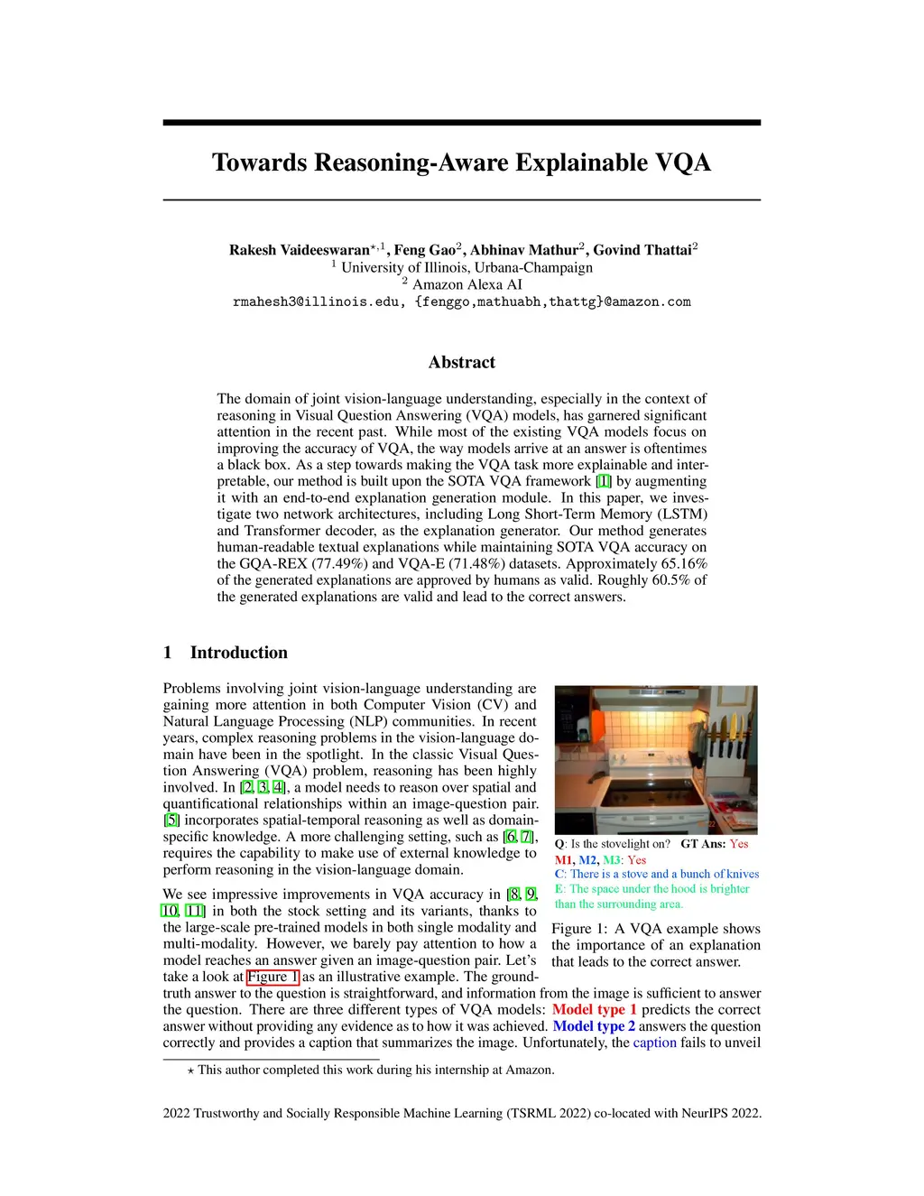 The domain of joint vision-language understanding, especially in the context of reasoning in Visual Question Answering (VQA) models, has garnered significant attention in the recent past. While most of the existing VQA models focus on improving the accuracy of VQA, the way models arrive at an answer is oftentimes a black box. As a step towards making the VQA task more explainable and interpretable, our method is built upon the SOTA VQA framework by augmenting it with an end-to-end explanation generation module. In this paper, we investigate two network architectures, including Long Short-Term Memory (LSTM) and Transformer decoder, as the explanation generator. Our method generates human-readable textual explanations while maintaining SOTA VQA accuracy on the GQA-REX (77.49%) and VQA-E (71.48%) datasets. Approximately 65.16% of the generated explanations are approved by humans as valid. Roughly 60.5% of the generated explanations are valid and lead to the correct answers.