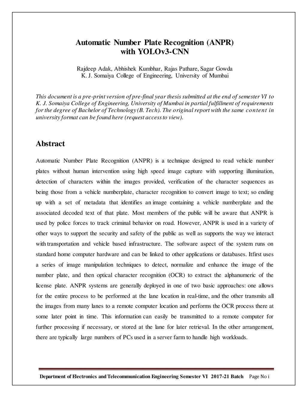 Automatic Number Plate Recognition (ANPR) with YOLOv3-CNN