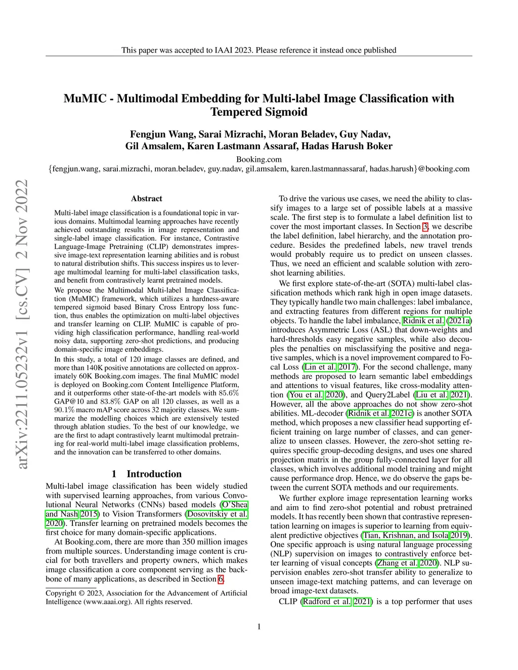 Multi-label image classification is a foundational topic in various domains. Multimodal learning approaches have recently achieved outstanding results in image representation and single-label image classification. For instance, Contrastive Language-Image Pretraining (CLIP) demonstrates impressive image-text representation learning abilities and is robust to natural distribution shifts. This success inspires us to leverage multimodal learning for multi-label classification tasks, and benefit from contrastively learnt pretrained models. We propose the Multimodal Multi-label Image Classification (MuMIC) framework, which utilizes a hardness-aware tempered sigmoid based Binary Cross Entropy loss function, thus enables the optimization on multi-label objectives and transfer learning on CLIP. MuMIC is capable of providing high classification performance, handling real-world noisy data, supporting zero-shot predictions, and producing domain-specific image embeddings. In this study, a total of 120 image classes are defined, and more than 140K positive annotations are collected on approximately 60K Booking.com images. The final MuMIC model is deployed on Booking.com Content Intelligence Platform, and it outperforms other state-of-the-art models with 85.6% GAP@10 and 83.8% GAP on all 120 classes, as well as a 90.1% macro mAP score across 32 majority classes. We summarize the modeling choices which are extensively tested through ablation studies. To the best of our knowledge, we are the first to adapt contrastively learnt multimodal pretraining for real-world multi-label image classification problems, and the innovation can be transferred to other domains.