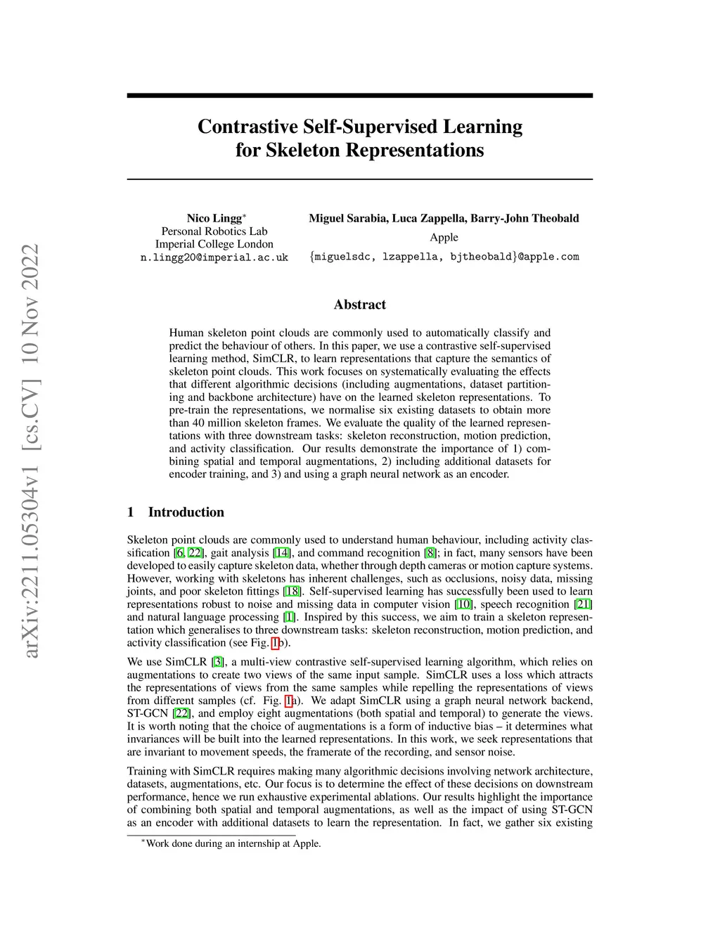 Contrastive Self-Supervised Learning for Skeleton Representations
