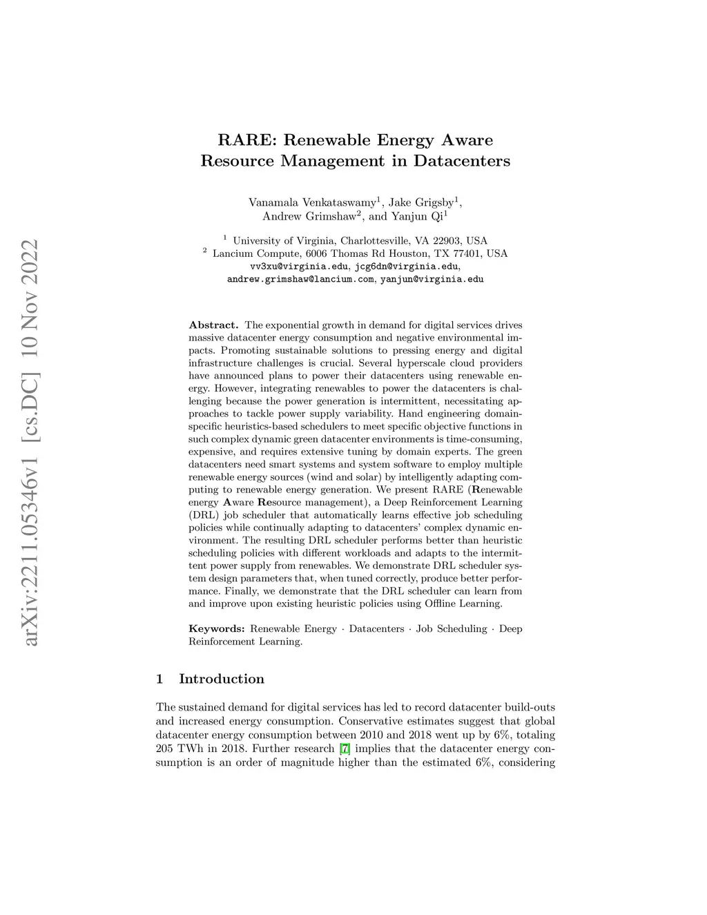 The exponential growth in demand for digital services drives massive datacenter energy consumption and negative environmental impacts. Promoting sustainable solutions to pressing energy and digital infrastructure challenges is crucial. Several hyperscale cloud providers have announced plans to power their datacenters using renewable energy. However, integrating renewables to power the datacenters is challenging because the power generation is intermittent, necessitating approaches to tackle power supply variability. Hand engineering domain-specific heuristics-based schedulers to meet specific objective functions in such complex dynamic green datacenter environments is time-consuming, expensive, and requires extensive tuning by domain experts. The green datacenters need smart systems and system software to employ multiple renewable energy sources (wind and solar) by intelligently adapting computing to renewable energy generation. We present RARE (Renewable energy Aware REsource management), a Deep Reinforcement Learning (DRL) job scheduler that automatically learns effective job scheduling policies while continually adapting to datacenters' complex dynamic environment. The resulting DRL scheduler performs better than heuristic scheduling policies with different workloads and adapts to the intermittent power supply from renewables. We demonstrate DRL scheduler system design parameters that, when tuned correctly, produce better performance. Finally, we demonstrate that the DRL scheduler can learn from and improve upon existing heuristic policies using Offline Learning.