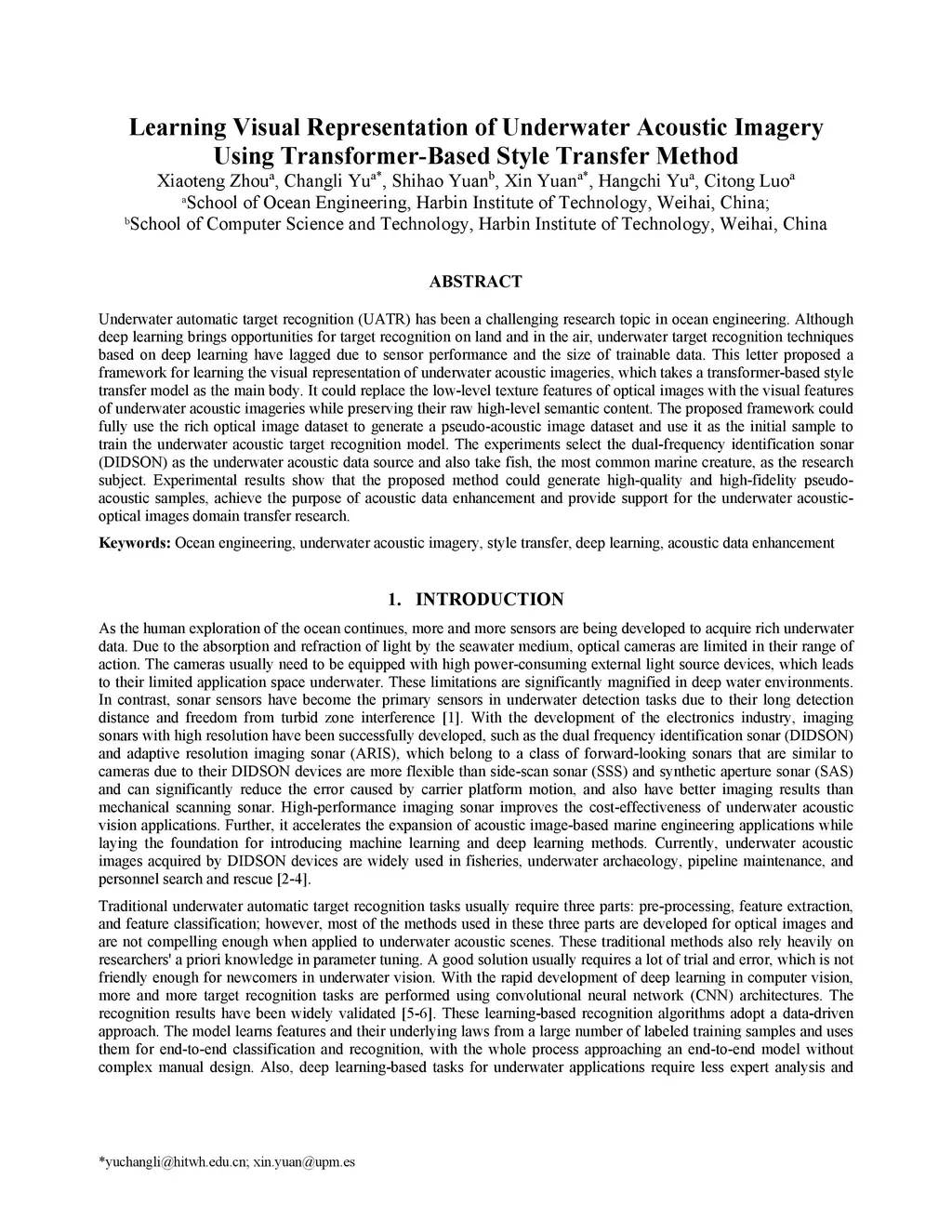 Underwater automatic target recognition (UATR) has been a challenging research topic in ocean engineering. Although deep learning brings opportunities for target recognition on land and in the air, underwater target recognition techniques based on deep learning have lagged due to sensor performance and the size of trainable data. This letter proposed a framework for learning the visual representation of underwater acoustic imageries, which takes a transformer-based style transfer model as the main body. It could replace the low-level texture features of optical images with the visual features of underwater acoustic imageries while preserving their raw high-level semantic content. The proposed framework could fully use the rich optical image dataset to generate a pseudo-acoustic image dataset and use it as the initial sample to train the underwater acoustic target recognition model. The experiments select the dual-frequency identification sonar (DIDSON) as the underwater acoustic data source and also take fish, the most common marine creature, as the research subject. Experimental results show that the proposed method could generate high-quality and high-fidelity pseudo-acoustic samples, achieve the purpose of acoustic data enhancement and provide support for the underwater acoustic-optical images domain transfer research.