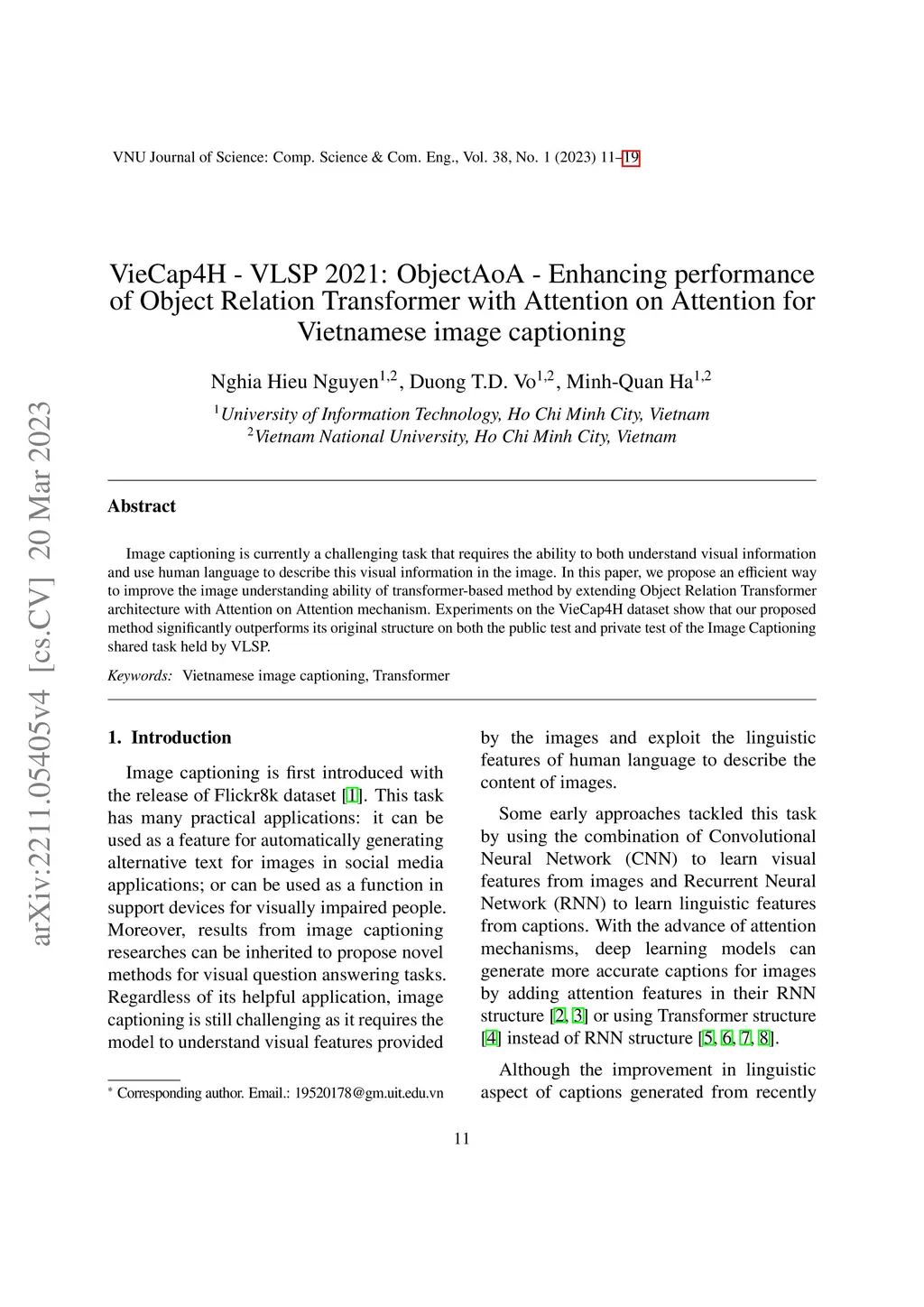 Image captioning is currently a challenging task that requires the ability to both understand visual information and use human language to describe this visual information in the image. In this paper, we propose an efficient way to improve the image understanding ability of transformer-based method by extending Object Relation Transformer architecture with Attention on Attention mechanism. Experiments on the VieCap4H dataset show that our proposed method significantly outperforms its original structure on both the public test and private test of the Image Captioning shared task held by VLSP.
