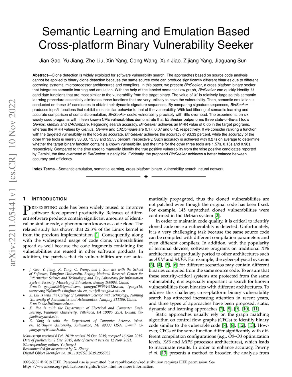 Clone detection is widely exploited for software vulnerability search. The approaches based on source code analysis cannot be applied to binary clone detection because the same source code can produce significantly different binaries. In this paper, we present BinSeeker, a cross-platform binary seeker that integrates semantic learning and emulation. With the help of the labeled semantic flow graph, BinSeeker can quickly identify M candidate functions that are most similar to the vulnerability from the target binary. The value of M is relatively large so this semantic learning procedure essentially eliminates those functions that are very unlikely to have the vulnerability. Then, semantic emulation is conducted on these M candidates to obtain their dynamic signature sequences. By comparing signature sequences, BinSeeker produces top-N functions that exhibit most similar behavior to that of the vulnerability. With fast filtering of semantic learning and accurate comparison of semantic emulation, BinSeeker seeks vulnerability precisely with little overhead. The experiments on six widely used programs with fifteen known CVE vulnerabilities demonstrate that BinSeeker outperforms three state-of-the-art tools Genius, Gemini and CACompare. Regarding search accuracy, BinSeeker achieves an MRR value of 0.65 in the target programs, whereas the MRR values by Genius, Gemini and CACompare are 0.17, 0.07 and 0.42, respectively. If we consider ranking a function with the targeted vulnerability in the top-5 as accurate, BinSeeker achieves the accuracy of 93.33 percent, while the accuracy of the other three tools is merely 33.33, 13.33 and 53.33 percent, respectively. Such accuracy is achieved with 0.27s on average to determine whether the target binary function contains a known vulnerability, and the time for the other three tools are 1.57s, 0.15s and 0.98s, respectively.