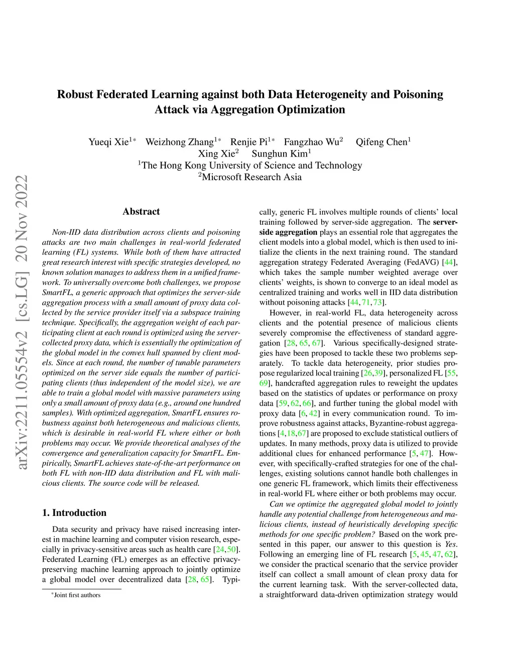 Non-IID data distribution across clients and poisoning attacks are two main challenges in real-world federated learning (FL) systems. While both of them have attracted great research interest with specific strategies developed, no known solution manages to address them in a unified framework. To universally overcome both challenges, we propose SmartFL, a generic approach that optimizes the server-side aggregation process with a small amount of proxy data collected by the service provider itself via a subspace training technique. Specifically, the aggregation weight of each participating client at each round is optimized using the server-collected proxy data, which is essentially the optimization of the global model in the convex hull spanned by client models. Since at each round, the number of tunable parameters optimized on the server side equals the number of participating clients (thus independent of the model size), we are able to train a global model with massive parameters using only a small amount of proxy data (e.g., around one hundred samples). With optimized aggregation, SmartFL ensures robustness against both heterogeneous and malicious clients, which is desirable in real-world FL where either or both problems may occur. We provide theoretical analyses of the convergence and generalization capacity for SmartFL. Empirically, SmartFL achieves state-of-the-art performance on both FL with non-IID data distribution and FL with malicious clients. The source code will be released.