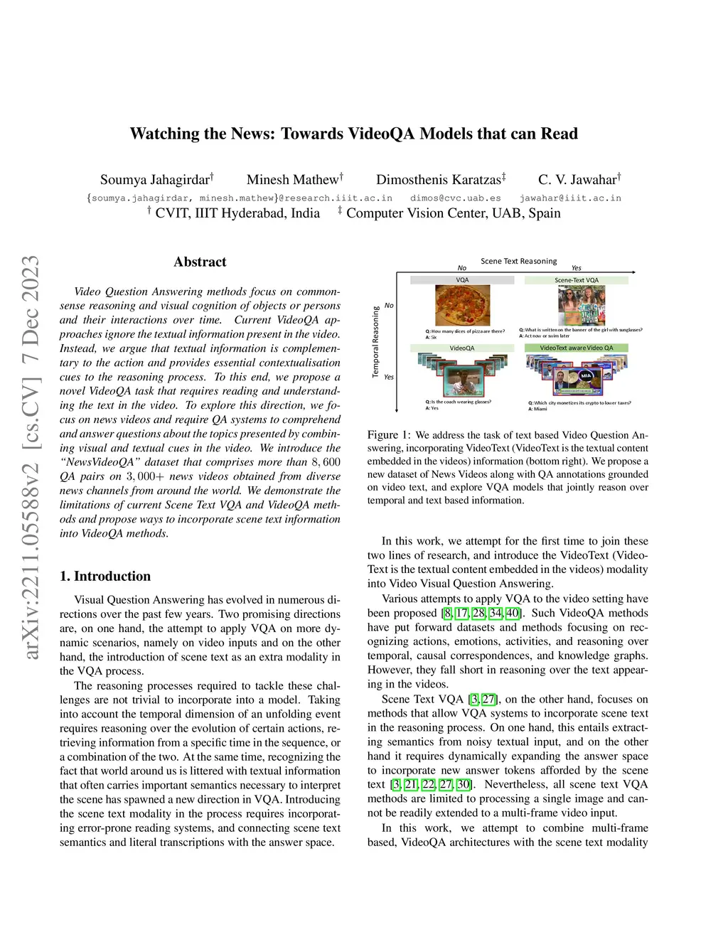 Video Question Answering methods focus on commonsense reasoning and visual cognition of objects or persons and their interactions over time. Current VideoQA approaches ignore the textual information present in the video. Instead, we argue that textual information is complementary to the action and provides essential contextualisation cues to the reasoning process. To this end, we propose a novel VideoQA task that requires reading and understanding the text in the video. To explore this direction, we focus on news videos and require QA systems to comprehend and answer questions about the topics presented by combining visual and textual cues in the video. We introduce the ``NewsVideoQA'' dataset that comprises more than QA pairs on news videos obtained from diverse news channels from around the world. We demonstrate the limitations of current Scene Text VQA and VideoQA methods and propose ways to incorporate scene text information into VideoQA methods.