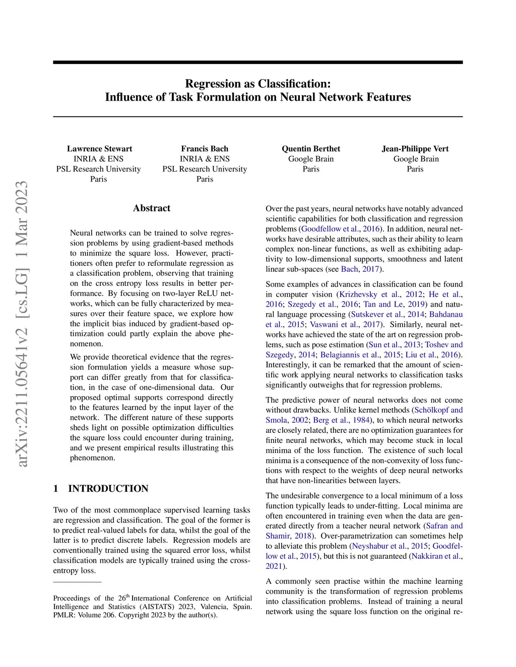 Neural networks can be trained to solve regression problems by using gradient-based methods to minimize the square loss. However, practitioners often prefer to reformulate regression as a classification problem, observing that training on the cross entropy loss results in better performance. By focusing on two-layer ReLU networks, which can be fully characterized by measures over their feature space, we explore how the implicit bias induced by gradient-based optimization could partly explain the above phenomenon. We provide theoretical evidence that the regression formulation yields a measure whose support can differ greatly from that for classification, in the case of one-dimensional data. Our proposed optimal supports correspond directly to the features learned by the input layer of the network. The different nature of these supports sheds light on possible optimization difficulties the square loss could encounter during training, and we present empirical results illustrating this phenomenon.