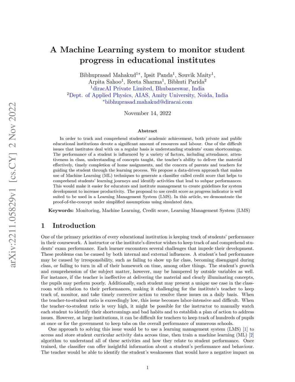 In order to track and comprehend the academic achievement of students, both private and public educational institutions devote a significant amount of resources and labour. One of the difficult issues that institutes deal with on a regular basis is understanding the exam shortcomings of students. The performance of a student is influenced by a variety of factors, including attendance, attentiveness in class, understanding of concepts taught, the teachers ability to deliver the material effectively, timely completion of home assignments, and the concern of parents and teachers for guiding the student through the learning process. We propose a data driven approach that makes use of Machine Learning techniques to generate a classifier called credit score that helps to comprehend the learning journeys of students and identify activities that lead to subpar performances. This would make it easier for educators and institute management to create guidelines for system development to increase productivity. The proposal to use credit score as progress indicator is well suited to be used in a Learning Management System. In this article, we demonstrate the proof of the concept under simplified assumptions using simulated data.