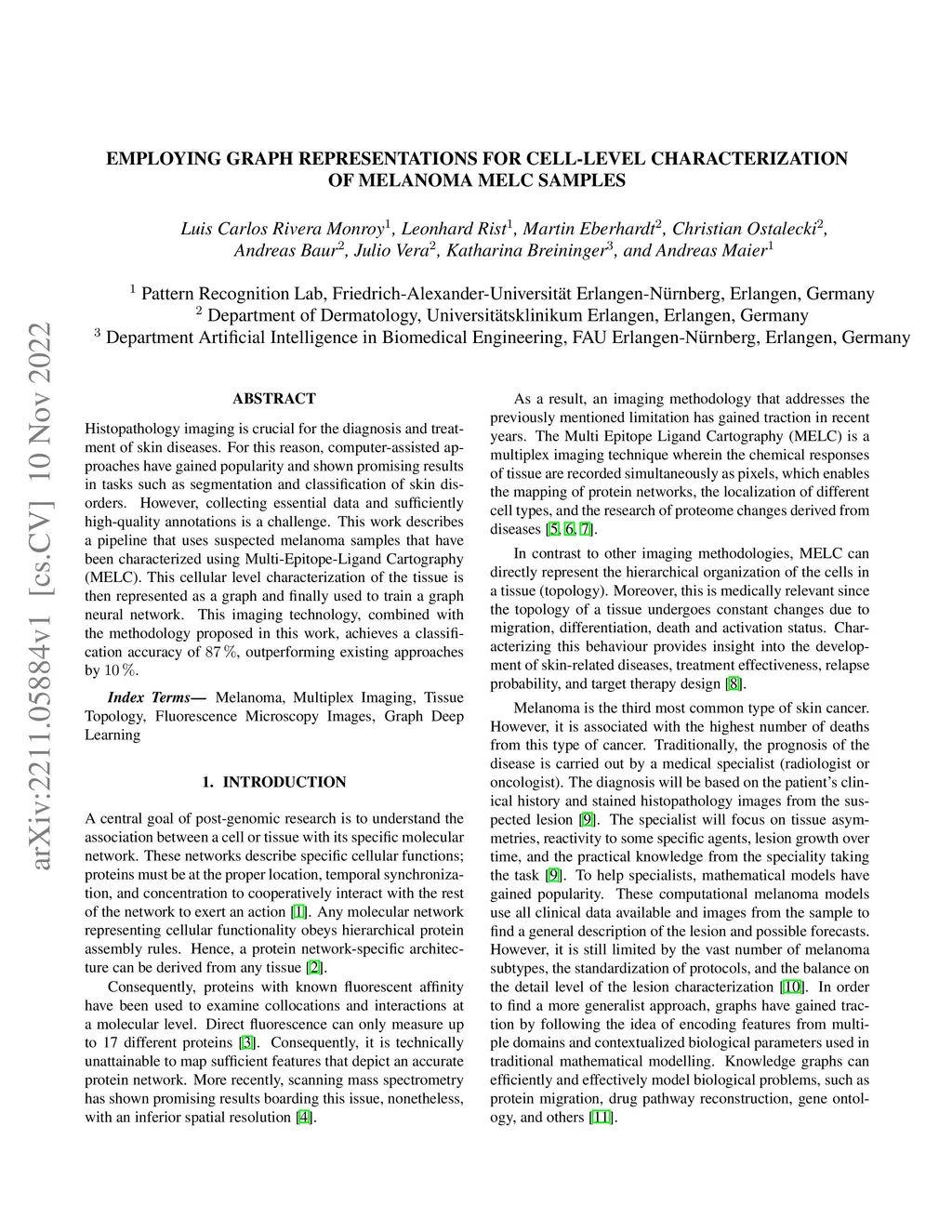 Histopathology imaging is crucial for the diagnosis and treatment of skin diseases. For this reason, computer-assisted approaches have gained popularity and shown promising results in tasks such as segmentation and classification of skin disorders. However, collecting essential data and sufficiently high-quality annotations is a challenge. This work describes a pipeline that uses suspected melanoma samples that have been characterized using Multi-Epitope-Ligand Cartography (MELC). This cellular-level tissue characterisation is then represented as a graph and used to train a graph neural network. This imaging technology, combined with the methodology proposed in this work, achieves a classification accuracy of 87%, outperforming existing approaches by 10%.
