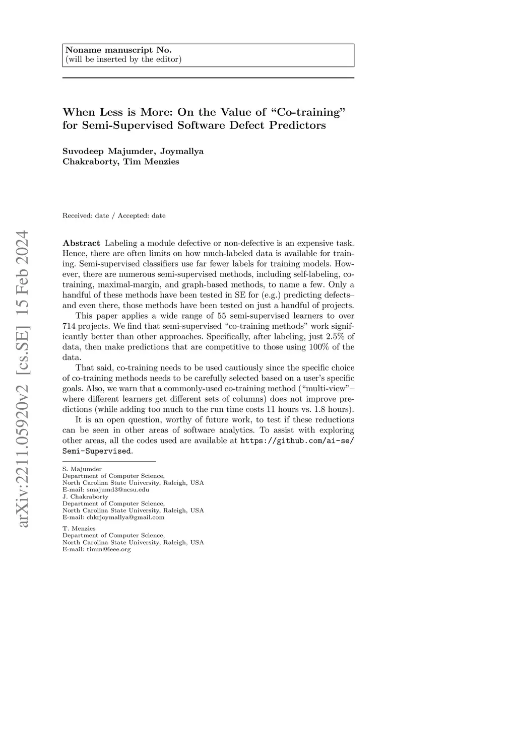Labeling a module defective or non-defective is an expensive task. Hence, there are often limits on how much-labeled data is available for training. Semi-supervised classifiers use far fewer labels for training models. However, there are numerous semi-supervised methods, including self-labeling, co-training, maximal-margin, and graph-based methods, to name a few. Only a handful of these methods have been tested in SE for (e.g.) predicting defects and even there, those methods have been tested on just a handful of projects. This paper applies a wide range of 55 semi-supervised learners to over 714 projects. We find that semi-supervised "co-training methods" work significantly better than other approaches. Specifically, after labeling, just 2.5% of data, then make predictions that are competitive to those using 100% of the data. That said, co-training needs to be used cautiously since the specific choice of co-training methods needs to be carefully selected based on a user's specific goals. Also, we warn that a commonly-used co-training method ("multi-view"-- where different learners get different sets of columns) does not improve predictions (while adding too much to the run time costs 11 hours vs. 1.8 hours). It is an open question, worthy of future work, to test if these reductions can be seen in other areas of software analytics. To assist with exploring other areas, all the codes used are available at https://github.com/ai-se/Semi-Supervised.