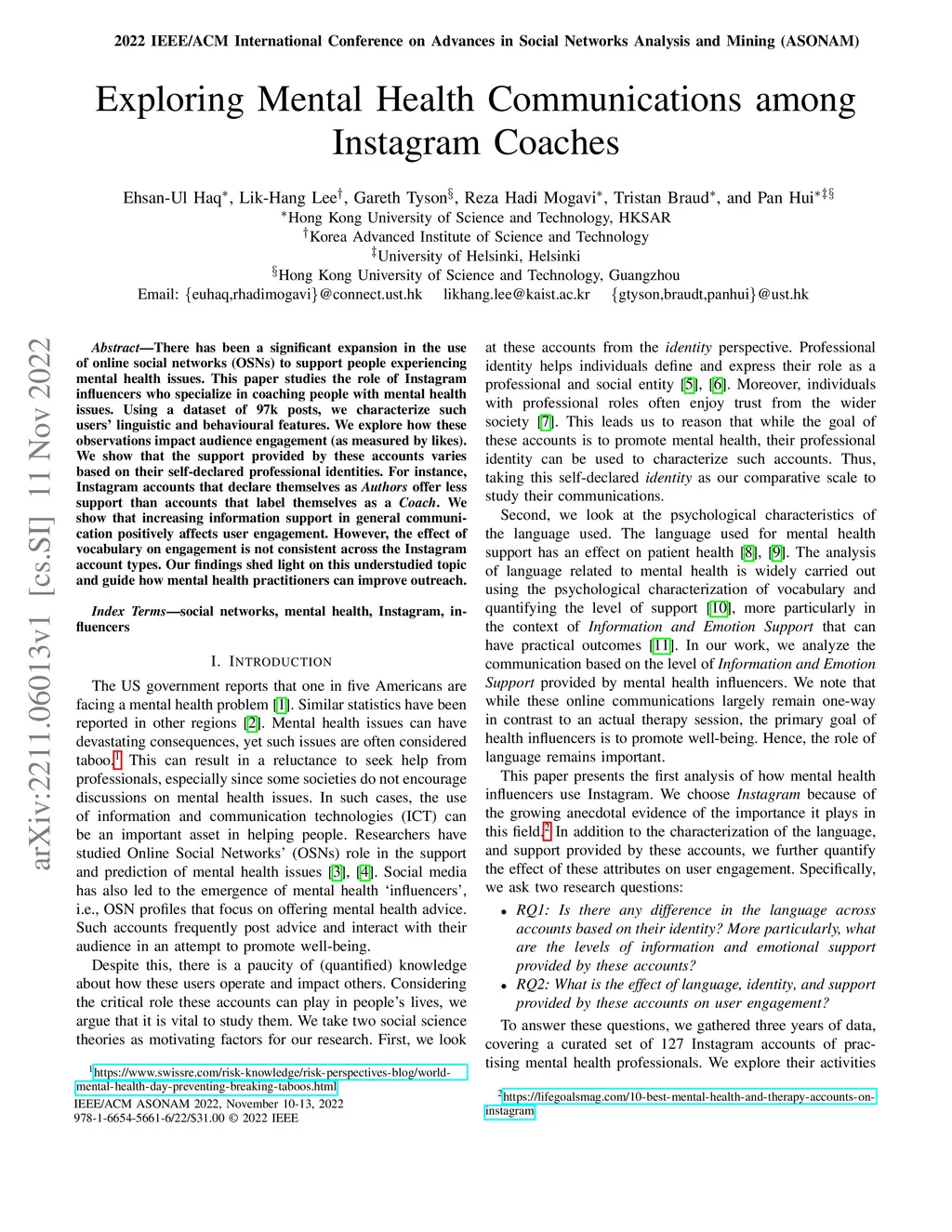 There has been a significant expansion in the use of online social networks (OSNs) to support people experiencing mental health issues. This paper studies the role of Instagram influencers who specialize in coaching people with mental health issues. Using a dataset of 97k posts, we characterize such users' linguistic and behavioural features. We explore how these observations impact audience engagement (as measured by likes). We show that the support provided by these accounts varies based on their self-declared professional identities. For instance, Instagram accounts that declare themselves as Authors offer less support than accounts that label themselves as Coach. We show that increasing information support in general communication positively affects user engagement. However, the effect of vocabulary on engagement is not consistent across the Instagram account types. Our findings shed light on this understudied topic and guide how mental health practitioners can improve outreach.