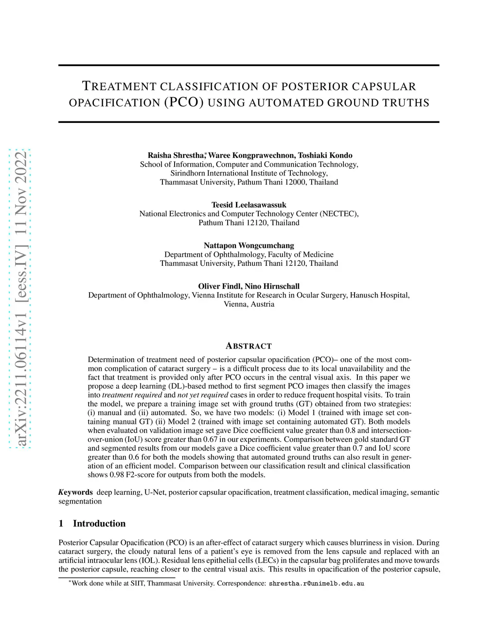 Determination of treatment need of posterior capsular opacification (PCO)-- one of the most common complication of cataract surgery -- is a difficult process due to its local unavailability and the fact that treatment is provided only after PCO occurs in the central visual axis. In this paper we propose a deep learning (DL)-based method to first segment PCO images then classify the images into \textit{treatment required} and \textit{not yet required} cases in order to reduce frequent hospital visits. To train the model, we prepare a training image set with ground truths (GT) obtained from two strategies: (i) manual and (ii) automated. So, we have two models: (i) Model 1 (trained with image set containing manual GT) (ii) Model 2 (trained with image set containing automated GT). Both models when evaluated on validation image set gave Dice coefficient value greater than 0.8 and intersection-over-union (IoU) score greater than 0.67 in our experiments. Comparison between gold standard GT and segmented results from our models gave a Dice coefficient value greater than 0.7 and IoU score greater than 0.6 for both the models showing that automated ground truths can also result in generation of an efficient model. Comparison between our classification result and clinical classification shows 0.98 F2-score for outputs from both the models.
