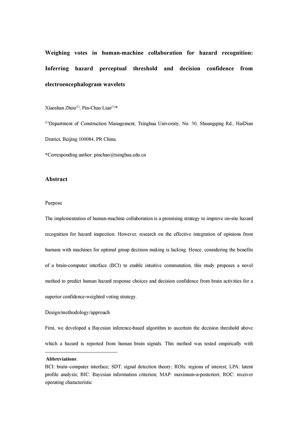 Purpose: Human-machine collaboration is a promising strategy to improve hazard inspection. However, research on the effective integration of opinions from humans with machines for optimal group decision making is lacking. Hence, considering the benefits of a brain-computer interface (BCI) to enable intuitive commutation, this study proposes a novel method to predict human hazard response choices and decision confidence from brain activities for a superior confidence-weighted voting strategy. Methodology: First, we developed a Bayesian inference-based algorithm to ascertain the decision threshold above which a hazard is reported from human brain signals. This method was tested empirically with electroencephalogram (EEG) data collected in a laboratory setting and cross-validated using behavioral indices of the signal detection theory. Subsequently, based on numerical simulations, the decision criteria for low-, medium-, and high-confidence level differentiations characterized by parietal alpha-band EEG power were determined. Findings : The investigated hazard recognition task was described as a process of probabilistic inference involving a decision uncertainty evaluation. The results demonstrated the feasibility of EEG measurements in observing human internal representations of hazard discrimination. Moreover, the optimal criteria to differentiate between low-, medium-, and high-confidence levels were obtained by benchmarking against an optimal Bayesian observer. Originality: This research demonstrates the potential of a BCI as an effective channel for telecommunication, laying the foundation for the design of future hazard detection techniques in the collaborative human-machine systems research field.