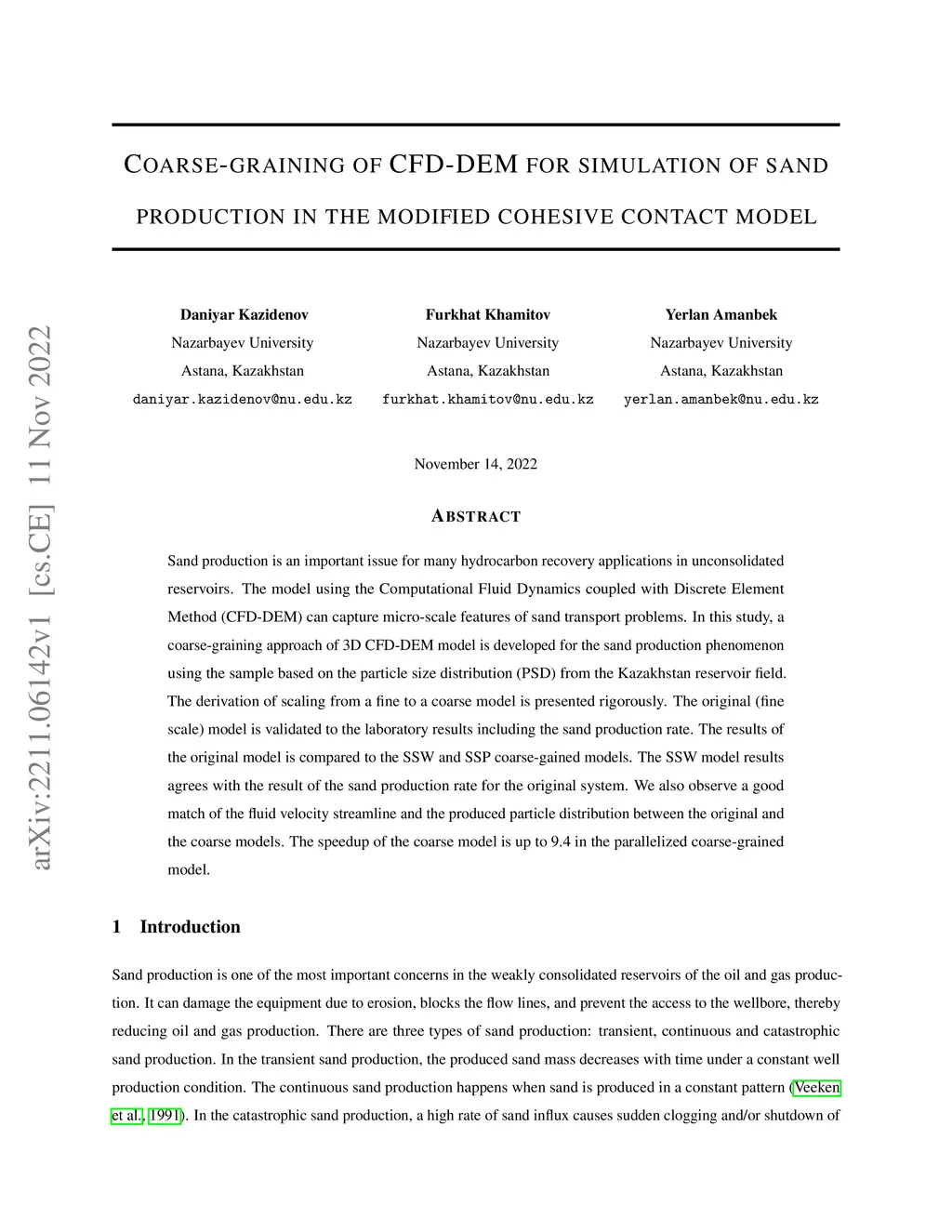 Sand production is an important issue for many hydrocarbon recovery applications in unconsolidated reservoirs. The model using the Computational Fluid Dynamics coupled with Discrete Element Method (CFD-DEM) can capture micro-scale features of sand transport problems. In this study, a coarse-graining approach of 3D CFD-DEM model is developed for the sand production phenomenon using the sample based on the particle size distribution (PSD) from the Kazakhstan reservoir field. The derivation of scaling from a fine to a coarse model is presented rigorously. The original (fine scale) model is validated to the laboratory results including the sand production rate. The results of the original model is compared to the SSW and SSP coarse-gained models. The SSW model results agrees with the result of the sand production rate for the original system. We also observe a good match of the fluid velocity streamline and the produced particle distribution between the original and the coarse models. The speedup of the coarse model is up to 9.4 in the parallelized coarse-grained model.