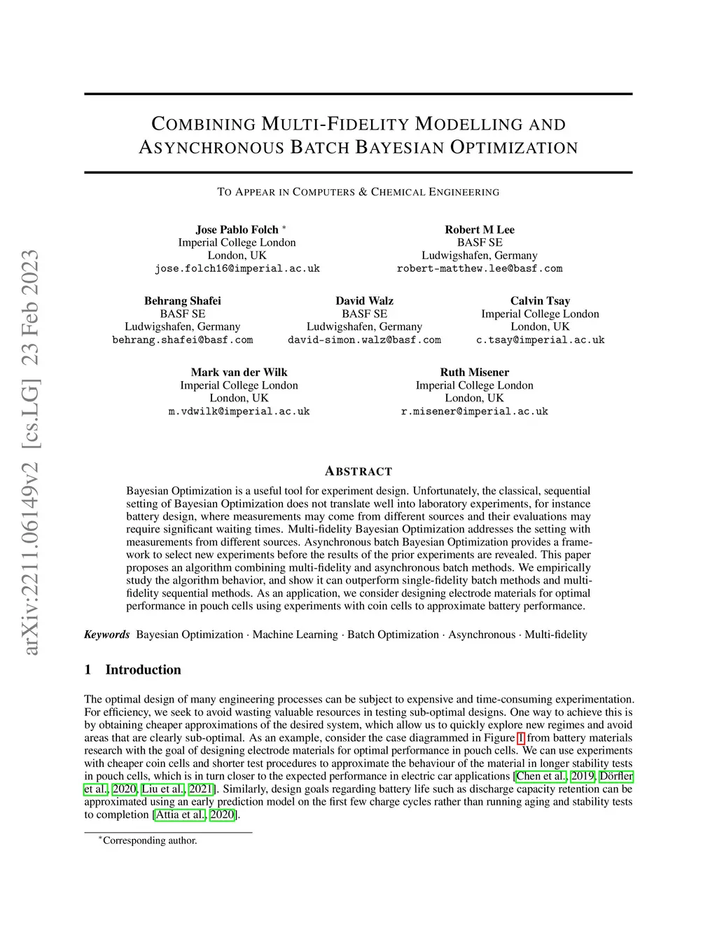 Bayesian Optimization is a useful tool for experiment design. Unfortunately, the classical, sequential setting of Bayesian Optimization does not translate well into laboratory experiments, for instance battery design, where measurements may come from different sources and their evaluations may require significant waiting times. Multi-fidelity Bayesian Optimization addresses the setting with measurements from different sources. Asynchronous batch Bayesian Optimization provides a framework to select new experiments before the results of the prior experiments are revealed. This paper proposes an algorithm combining multi-fidelity and asynchronous batch methods. We empirically study the algorithm behavior, and show it can outperform single-fidelity batch methods and multi-fidelity sequential methods. As an application, we consider designing electrode materials for optimal performance in pouch cells using experiments with coin cells to approximate battery performance.
