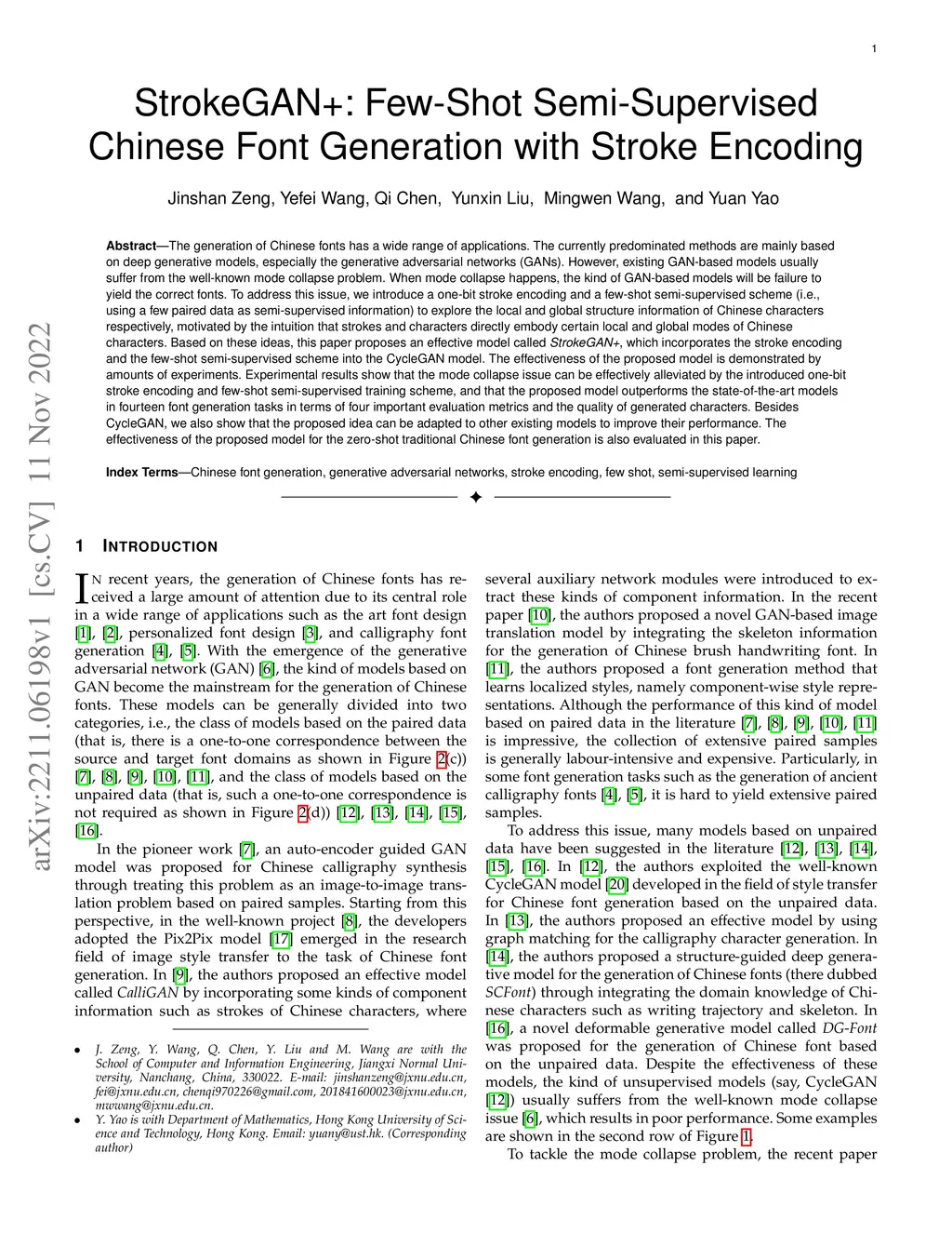 StrokeGAN+: Few-Shot Semi-Supervised Chinese Font Generation with Stroke