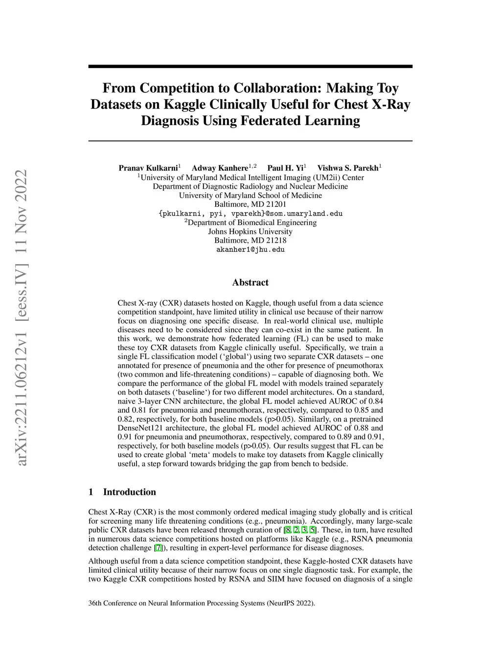 Chest X-ray (CXR) datasets hosted on Kaggle, though useful from a data science competition standpoint, have limited utility in clinical use because of their narrow focus on diagnosing one specific disease. In real-world clinical use, multiple diseases need to be considered since they can co-exist in the same patient. In this work, we demonstrate how federated learning (FL) can be used to make these toy CXR datasets from Kaggle clinically useful. Specifically, we train a single FL classification model (`global`) using two separate CXR datasets -- one annotated for presence of pneumonia and the other for presence of pneumothorax (two common and life-threatening conditions) -- capable of diagnosing both. We compare the performance of the global FL model with models trained separately on both datasets (`baseline`) for two different model architectures. On a standard, naive 3-layer CNN architecture, the global FL model achieved AUROC of 0.84 and 0.81 for pneumonia and pneumothorax, respectively, compared to 0.85 and 0.82, respectively, for both baseline models (p>0.05). Similarly, on a pretrained DenseNet121 architecture, the global FL model achieved AUROC of 0.88 and 0.91 for pneumonia and pneumothorax, respectively, compared to 0.89 and 0.91, respectively, for both baseline models (p>0.05). Our results suggest that FL can be used to create global `meta` models to make toy datasets from Kaggle clinically useful, a step forward towards bridging the gap from bench to bedside.