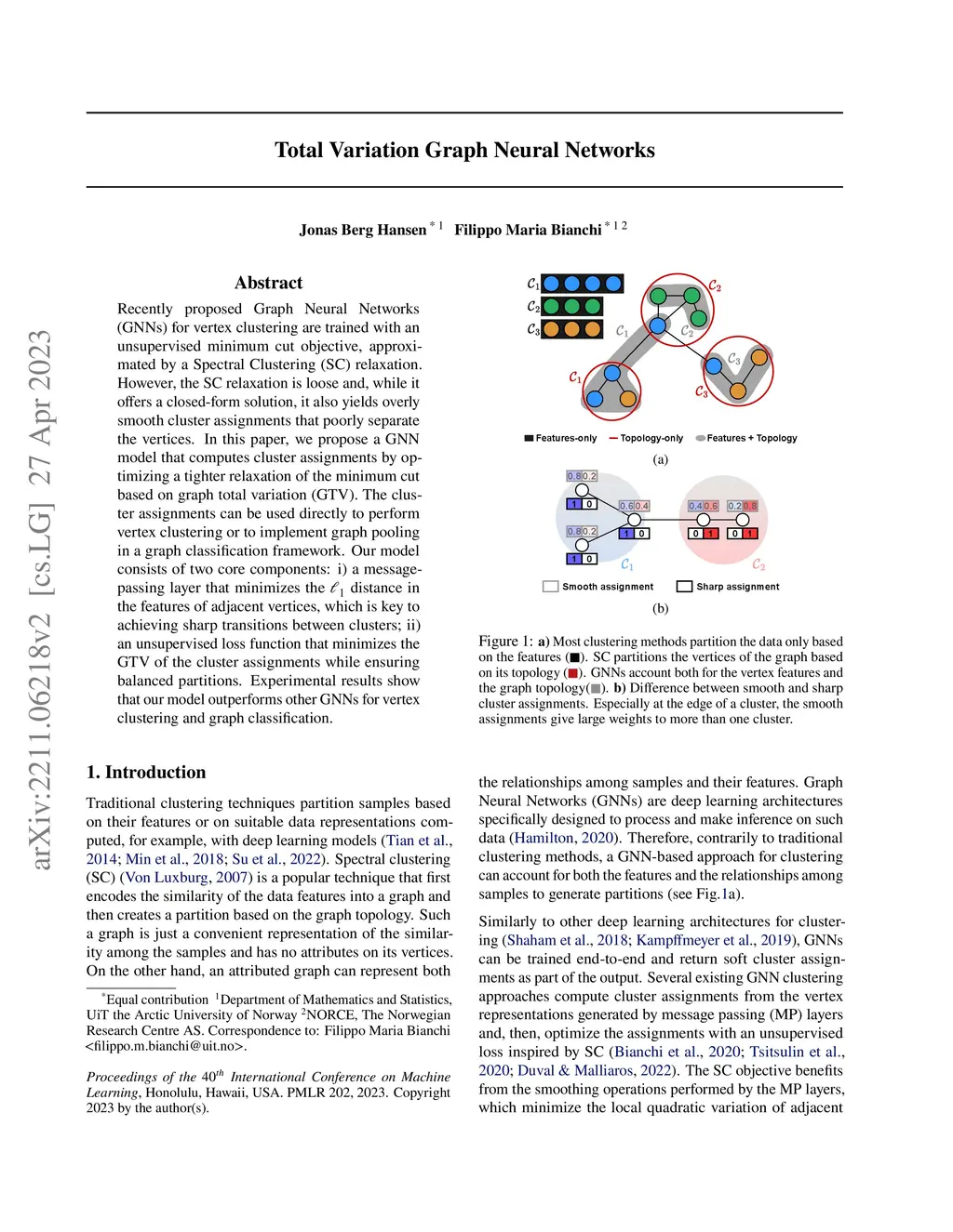 Recently proposed Graph Neural Networks (GNNs) for vertex clustering are trained with an unsupervised minimum cut objective, approximated by a Spectral Clustering (SC) relaxation. However, the SC relaxation is loose and, while it offers a closed-form solution, it also yields overly smooth cluster assignments that poorly separate the vertices. In this paper, we propose a GNN model that computes cluster assignments by optimizing a tighter relaxation of the minimum cut based on graph total variation (GTV). The cluster assignments can be used directly to perform vertex clustering or to implement graph pooling in a graph classification framework. Our model consists of two core components: i) a message-passing layer that minimizes the distance in the features of adjacent vertices, which is key to achieving sharp transitions between clusters; ii) an unsupervised loss function that minimizes the GTV of the cluster assignments while ensuring balanced partitions. Experimental results show that our model outperforms other GNNs for vertex clustering and graph classification.