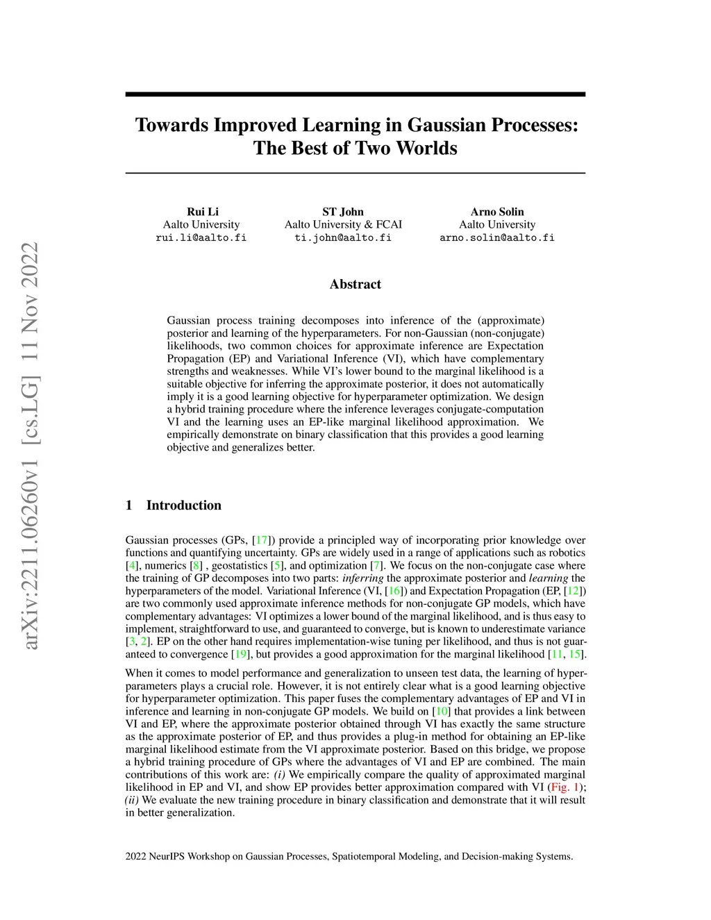Gaussian process training decomposes into inference of the (approximate) posterior and learning of the hyperparameters. For non-Gaussian (non-conjugate) likelihoods, two common choices for approximate inference are Expectation Propagation (EP) and Variational Inference (VI), which have complementary strengths and weaknesses. While VI's lower bound to the marginal likelihood is a suitable objective for inferring the approximate posterior, it does not automatically imply it is a good learning objective for hyperparameter optimization. We design a hybrid training procedure where the inference leverages conjugate-computation VI and the learning uses an EP-like marginal likelihood approximation. We empirically demonstrate on binary classification that this provides a good learning objective and generalizes better.