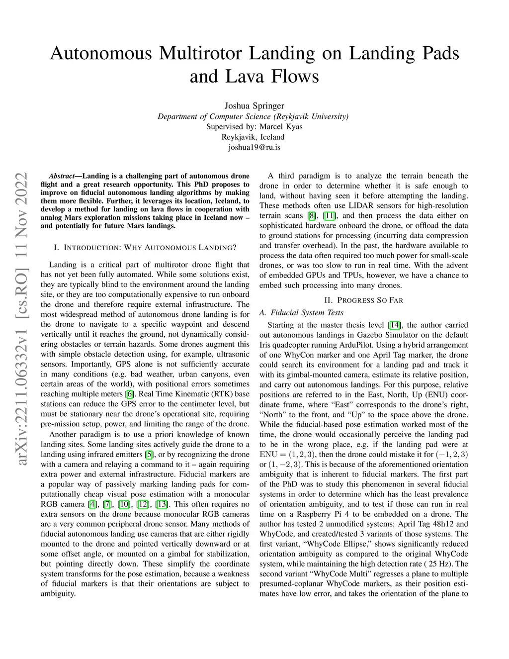 Landing is a challenging part of autonomous drone flight and a great research opportunity. This PhD proposes to improve on fiducial autonomous landing algorithms by making them more flexible. Further, it leverages its location, Iceland, to develop a method for landing on lava flows in cooperation with analog Mars exploration missions taking place in Iceland now - and potentially for future Mars landings.