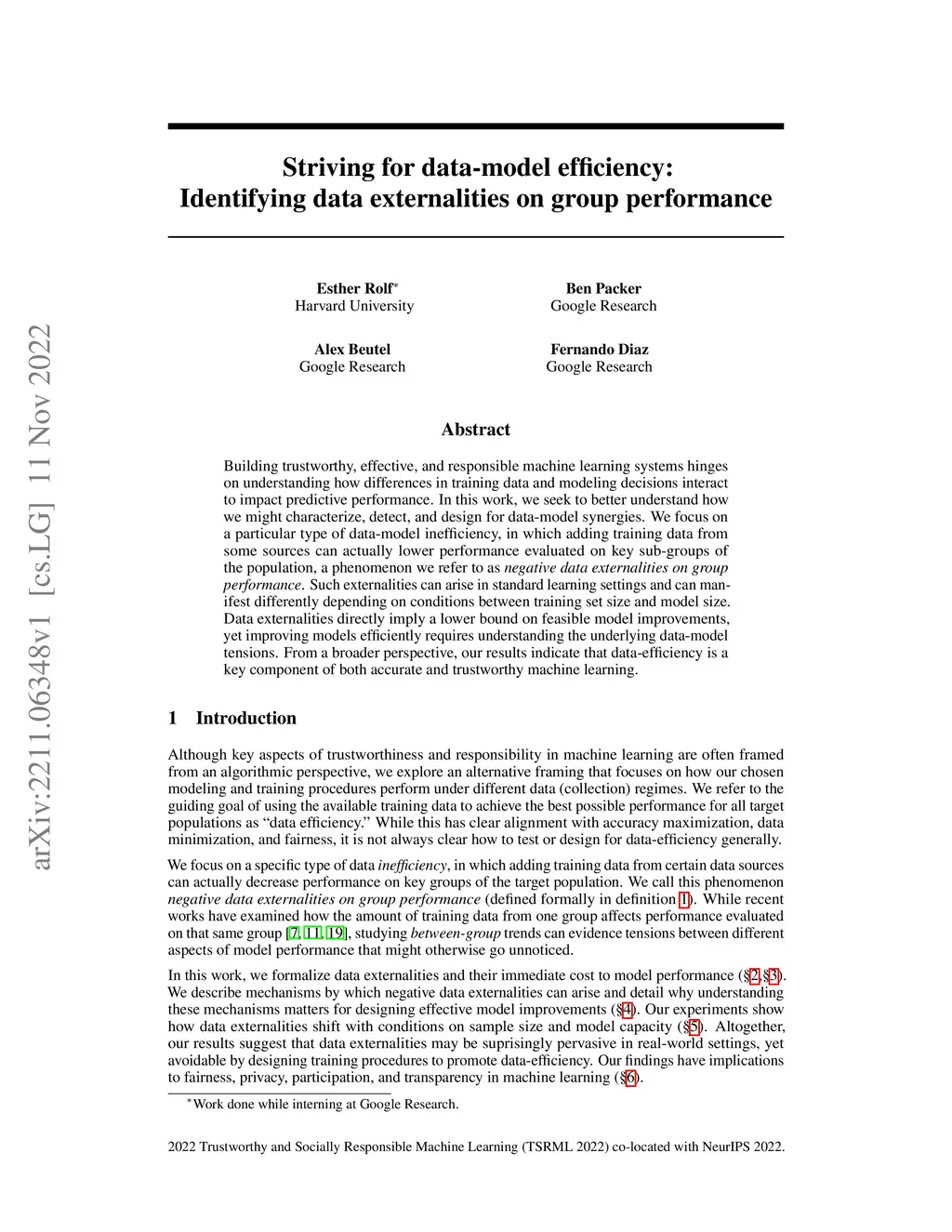 Building trustworthy, effective, and responsible machine learning systems hinges on understanding how differences in training data and modeling decisions interact to impact predictive performance. In this work, we seek to better understand how we might characterize, detect, and design for data-model synergies. We focus on a particular type of data-model inefficiency, in which adding training data from some sources can actually lower performance evaluated on key sub-groups of the population, a phenomenon we refer to as negative data externalities on group performance. Such externalities can arise in standard learning settings and can manifest differently depending on conditions between training set size and model size. Data externalities directly imply a lower bound on feasible model improvements, yet improving models efficiently requires understanding the underlying data-model tensions. From a broader perspective, our results indicate that data-efficiency is a key component of both accurate and trustworthy machine learning.
