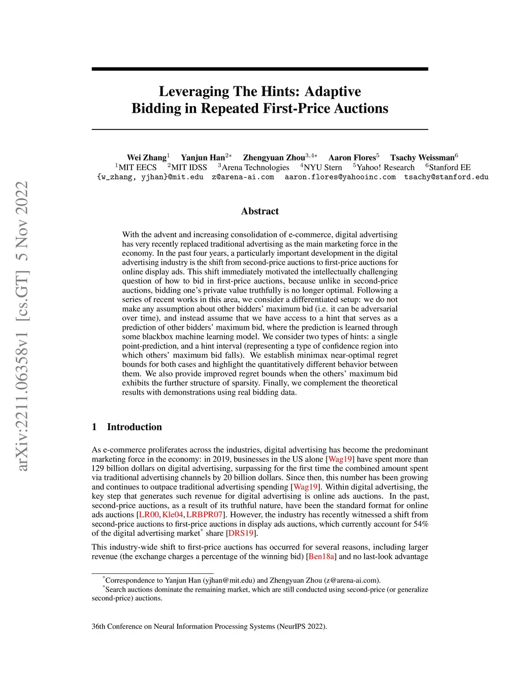 With the advent and increasing consolidation of e-commerce, digital advertising has very recently replaced traditional advertising as the main marketing force in the economy. In the past four years, a particularly important development in the digital advertising industry is the shift from second-price auctions to first-price auctions for online display ads. This shift immediately motivated the intellectually challenging question of how to bid in first-price auctions, because unlike in second-price auctions, bidding one's private value truthfully is no longer optimal. Following a series of recent works in this area, we consider a differentiated setup: we do not make any assumption about other bidders' maximum bid (i.e. it can be adversarial over time), and instead assume that we have access to a hint that serves as a prediction of other bidders' maximum bid, where the prediction is learned through some blackbox machine learning model. We consider two types of hints: one where a single point-prediction is available, and the other where a hint interval (representing a type of confidence region into which others' maximum bid falls) is available. We establish minimax optimal regret bounds for both cases and highlight the quantitatively different behavior between the two settings. We also provide improved regret bounds when the others' maximum bid exhibits the further structure of sparsity. Finally, we complement the theoretical results with demonstrations using real bidding data.