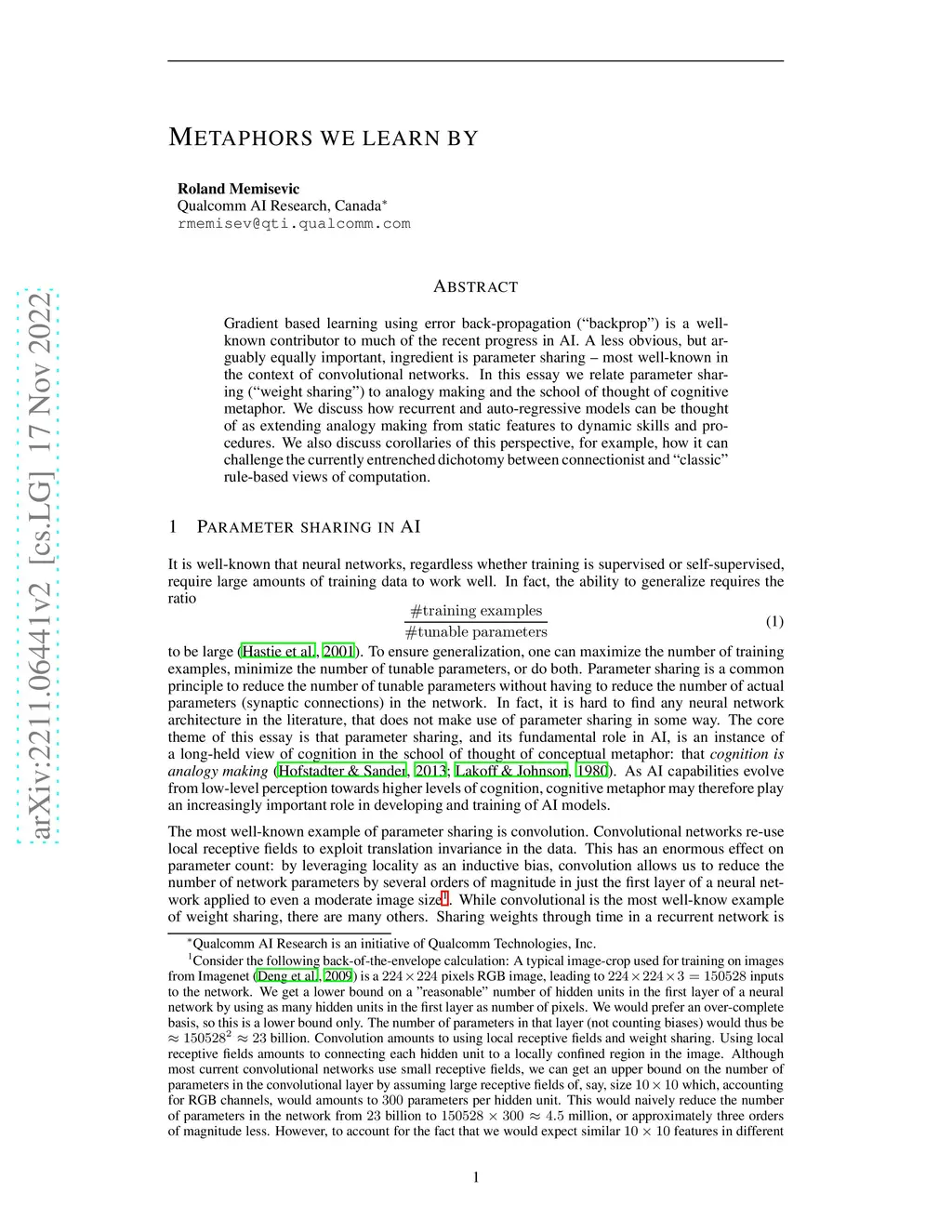 Gradient based learning using error back-propagation (``backprop'') is a well-known contributor to much of the recent progress in AI. A less obvious, but arguably equally important, ingredient is parameter sharing - most well-known in the context of convolutional networks. In this essay we relate parameter sharing (``weight sharing'') to analogy making and the school of thought of cognitive metaphor. We discuss how recurrent and auto-regressive models can be thought of as extending analogy making from static features to dynamic skills and procedures. We also discuss corollaries of this perspective, for example, how it can challenge the currently entrenched dichotomy between connectionist and ``classic'' rule-based views of computation.