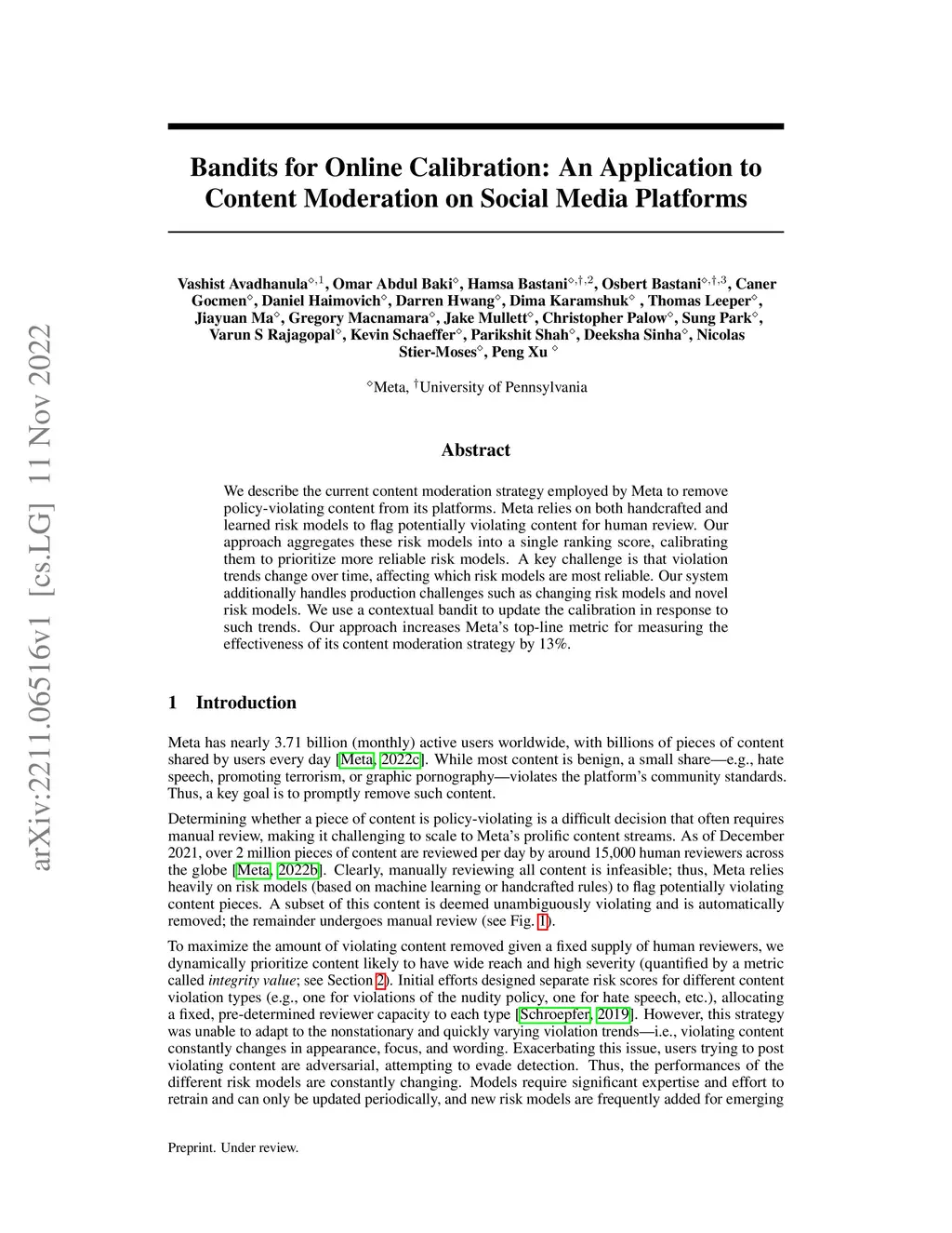 We describe the current content moderation strategy employed by Meta to remove policy-violating content from its platforms. Meta relies on both handcrafted and learned risk models to flag potentially violating content for human review. Our approach aggregates these risk models into a single ranking score, calibrating them to prioritize more reliable risk models. A key challenge is that violation trends change over time, affecting which risk models are most reliable. Our system additionally handles production challenges such as changing risk models and novel risk models. We use a contextual bandit to update the calibration in response to such trends. Our approach increases Meta's top-line metric for measuring the effectiveness of its content moderation strategy by 13%.