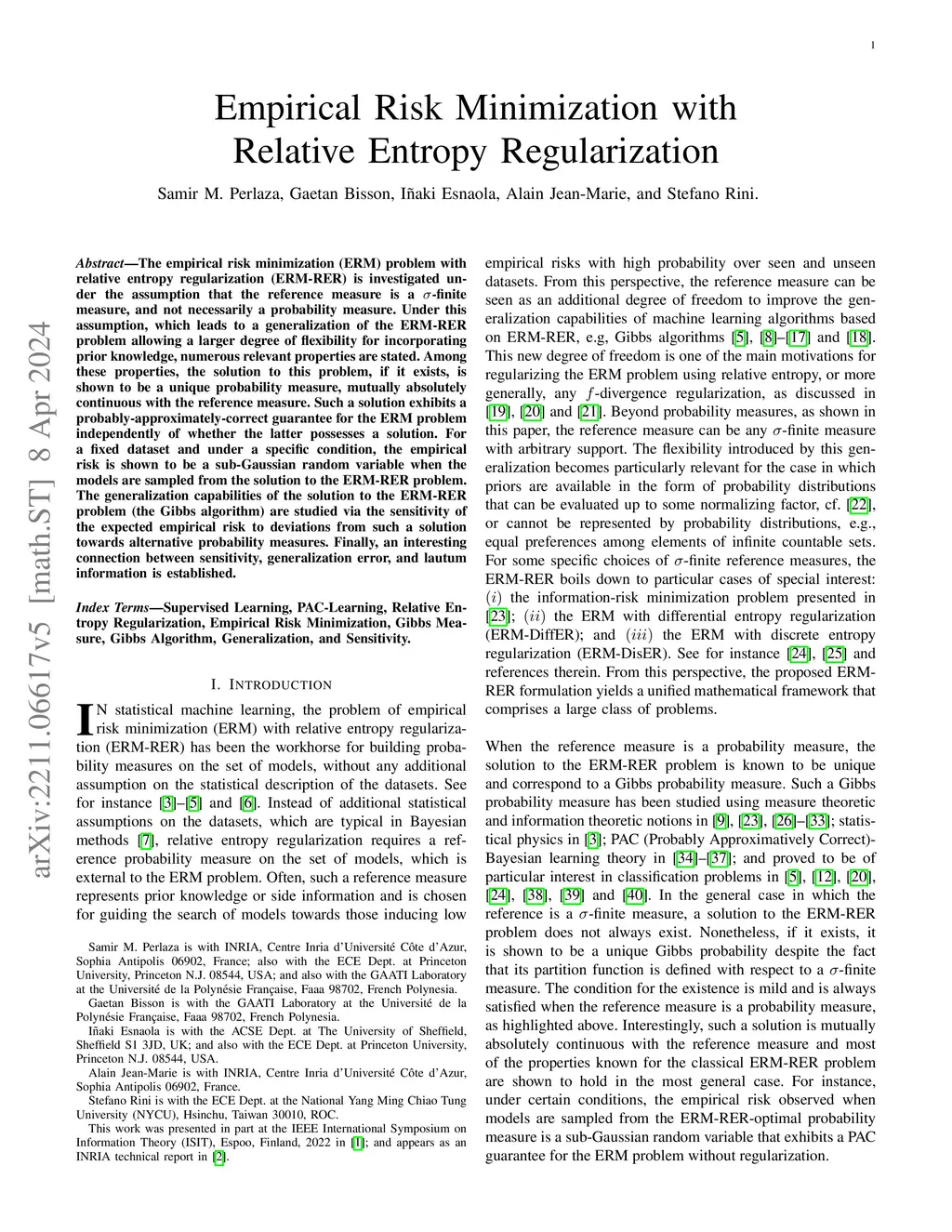 The empirical risk minimization (ERM) problem with relative entropy regularization (ERM-RER) is investigated under the assumption that the reference measure is a -finite measure, and not necessarily a probability measure. Under this assumption, which leads to a generalization of the ERM-RER problem allowing a larger degree of flexibility for incorporating prior knowledge, numerous relevant properties are stated. Among these properties, the solution to this problem, if it exists, is shown to be a unique probability measure, mutually absolutely continuous with the reference measure. Such a solution exhibits a probably-approximately-correct guarantee for the ERM problem independently of whether the latter possesses a solution. For a fixed dataset and under a specific condition, the empirical risk is shown to be a sub-Gaussian random variable when the models are sampled from the solution to the ERM-RER problem. The generalization capabilities of the solution to the ERM-RER problem (the Gibbs algorithm) are studied via the sensitivity of the expected empirical risk to deviations from such a solution towards alternative probability measures. Finally, an interesting connection between sensitivity, generalization error, and lautum information is established.
