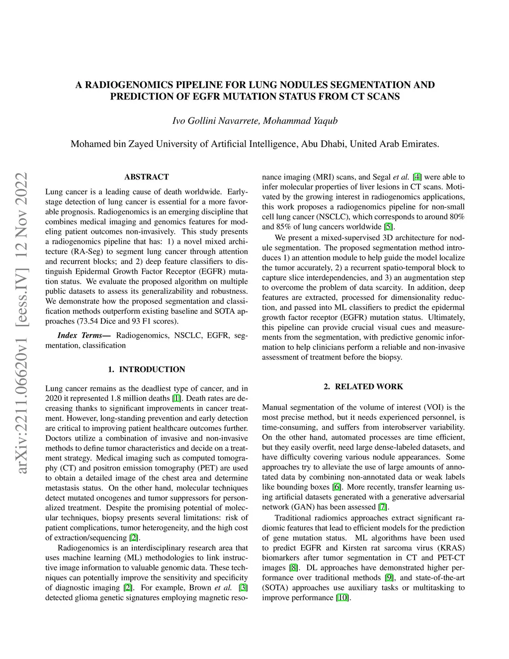Lung cancer is a leading cause of death worldwide. Early-stage detection of lung cancer is essential for a more favorable prognosis. Radiogenomics is an emerging discipline that combines medical imaging and genomics features for modeling patient outcomes non-invasively. This study presents a radiogenomics pipeline that has: 1) a novel mixed architecture (RA-Seg) to segment lung cancer through attention and recurrent blocks; and 2) deep feature classifiers to distinguish Epidermal Growth Factor Receptor (EGFR) mutation status. We evaluate the proposed algorithm on multiple public datasets to assess its generalizability and robustness. We demonstrate how the proposed segmentation and classification methods outperform existing baseline and SOTA approaches (73.54 Dice and 93 F1 scores).