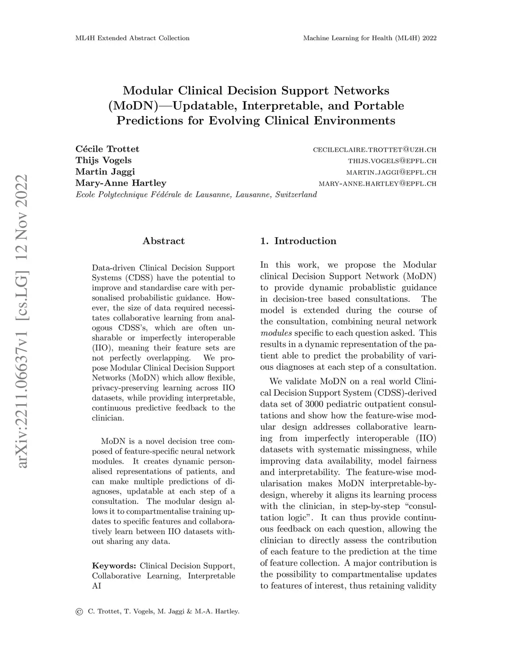 Data-driven Clinical Decision Support Systems (CDSS) have the potential to improve and standardise care with personalised probabilistic guidance. However, the size of data required necessitates collaborative learning from analogous CDSS's, which are often unsharable or imperfectly interoperable (IIO), meaning their feature sets are not perfectly overlapping. We propose Modular Clinical Decision Support Networks (MoDN) which allow flexible, privacy-preserving learning across IIO datasets, while providing interpretable, continuous predictive feedback to the clinician. MoDN is a novel decision tree composed of feature-specific neural network modules. It creates dynamic personalised representations of patients, and can make multiple predictions of diagnoses, updatable at each step of a consultation. The modular design allows it to compartmentalise training updates to specific features and collaboratively learn between IIO datasets without sharing any data.