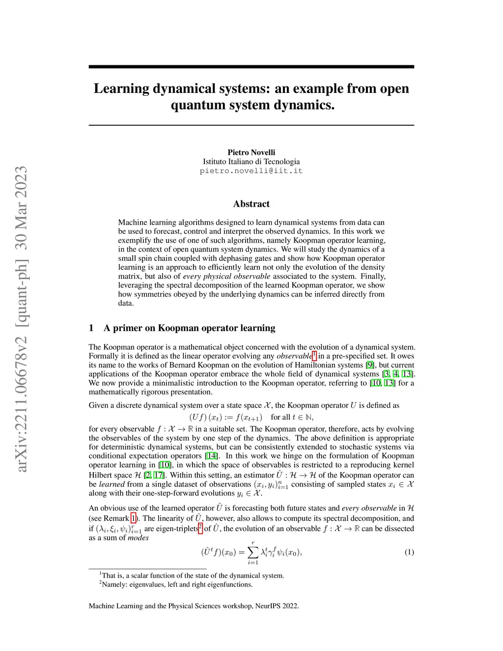 Machine learning algorithms designed to learn dynamical systems from data can be used to forecast, control and interpret the observed dynamics. In this work we exemplify the use of one of such algorithms, namely Koopman operator learning, in the context of open quantum system dynamics. We will study the dynamics of a small spin chain coupled with dephasing gates and show how Koopman operator learning is an approach to efficiently learn not only the evolution of the density matrix, but also of every physical observable associated to the system. Finally, leveraging the spectral decomposition of the learned Koopman operator, we show how symmetries obeyed by the underlying dynamics can be inferred directly from data.