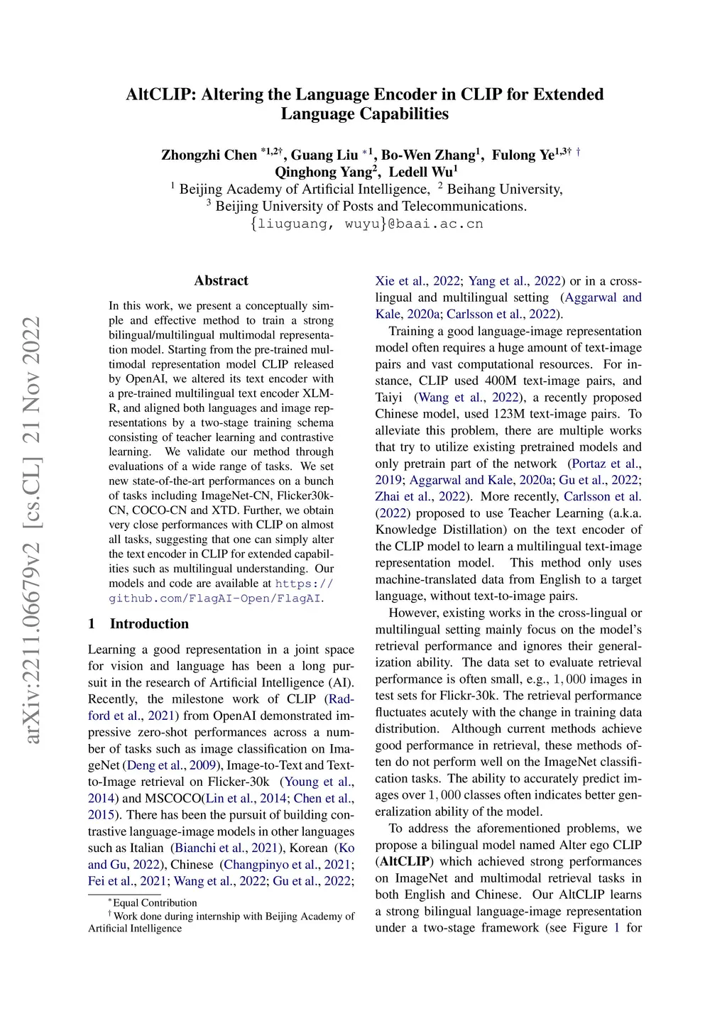 In this work, we present a conceptually simple and effective method to train a strong bilingual/multilingual multimodal representation model. Starting from the pre-trained multimodal representation model CLIP released by OpenAI, we altered its text encoder with a pre-trained multilingual text encoder XLM-R, and aligned both languages and image representations by a two-stage training schema consisting of teacher learning and contrastive learning. We validate our method through evaluations of a wide range of tasks. We set new state-of-the-art performances on a bunch of tasks including ImageNet-CN, Flicker30k-CN, COCO-CN and XTD. Further, we obtain very close performances with CLIP on almost all tasks, suggesting that one can simply alter the text encoder in CLIP for extended capabilities such as multilingual understanding. Our models and code are available at https://github.com/FlagAI-Open/FlagAI.