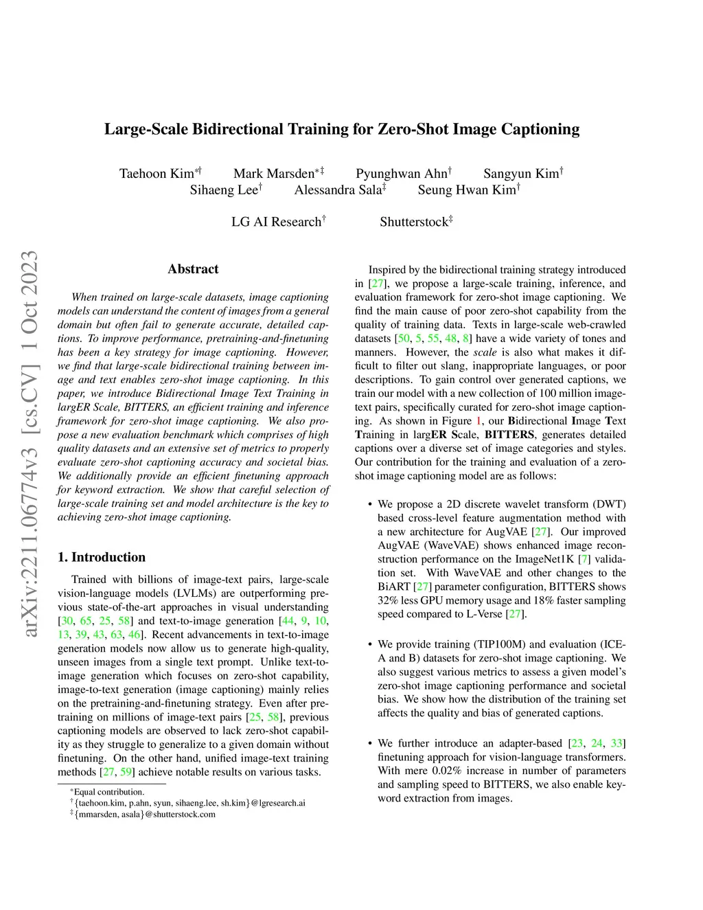 When trained on large-scale datasets, image captioning models can understand the content of images from a general domain but often fail to generate accurate, detailed captions. To improve performance, pretraining-and-finetuning has been a key strategy for image captioning. However, we find that large-scale bidirectional training between image and text enables zero-shot image captioning. In this paper, we introduce Bidirectional Image Text Training in largER Scale, BITTERS, an efficient training and inference framework for zero-shot image captioning. We also propose a new evaluation benchmark which comprises of high quality datasets and an extensive set of metrics to properly evaluate zero-shot captioning accuracy and societal bias. We additionally provide an efficient finetuning approach for keyword extraction. We show that careful selection of large-scale training set and model architecture is the key to achieving zero-shot image captioning.