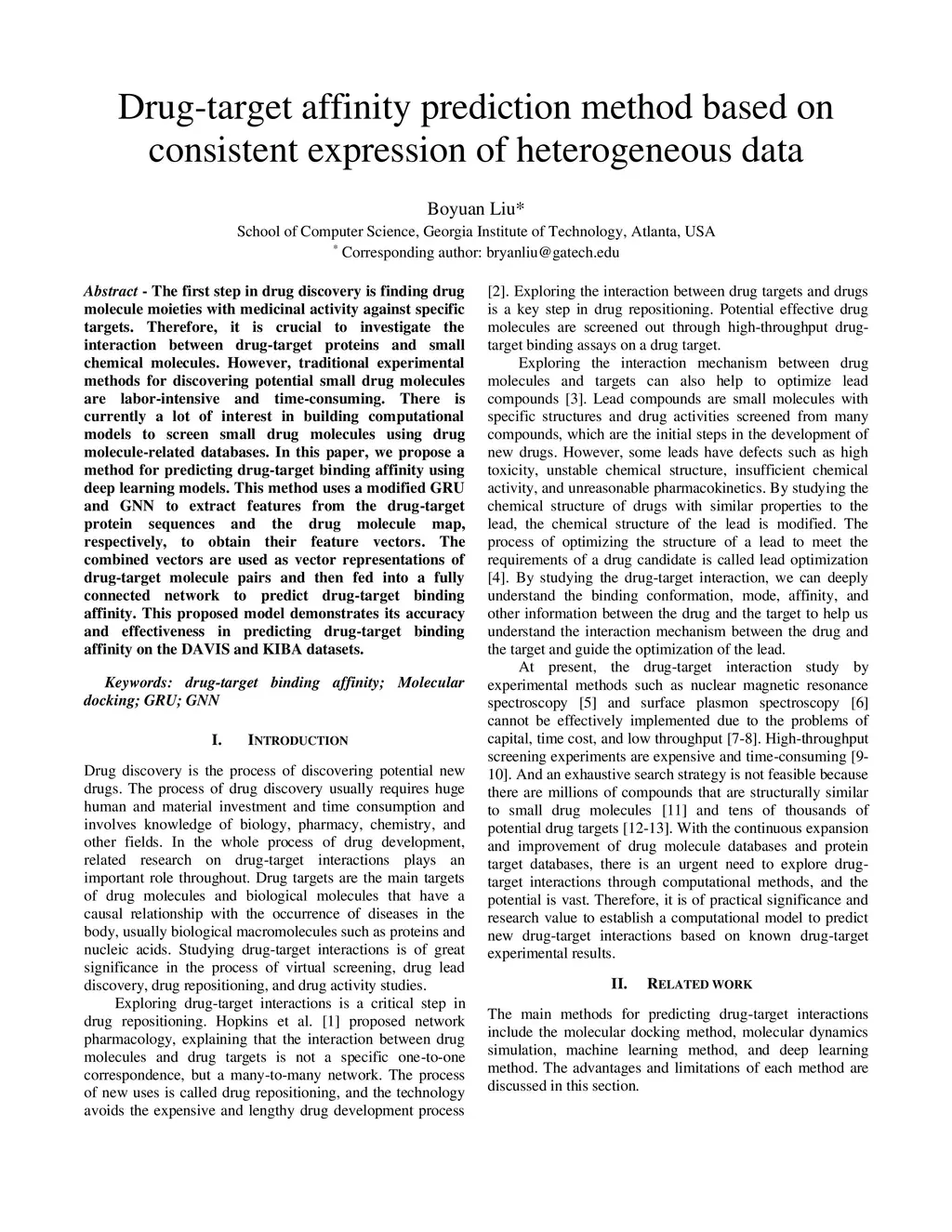 The first step in drug discovery is finding drug molecule moieties with medicinal activity against specific targets. Therefore, it is crucial to investigate the interaction between drug-target proteins and small chemical molecules. However, traditional experimental methods for discovering potential small drug molecules are labor-intensive and time-consuming. There is currently a lot of interest in building computational models to screen small drug molecules using drug molecule-related databases. In this paper, we propose a method for predicting drug-target binding affinity using deep learning models. This method uses a modified GRU and GNN to extract features from the drug-target protein sequences and the drug molecule map, respectively, to obtain their feature vectors. The combined vectors are used as vector representations of drug-target molecule pairs and then fed into a fully connected network to predict drug-target binding affinity. This proposed model demonstrates its accuracy and effectiveness in predicting drug-target binding affinity on the DAVIS and KIBA datasets.