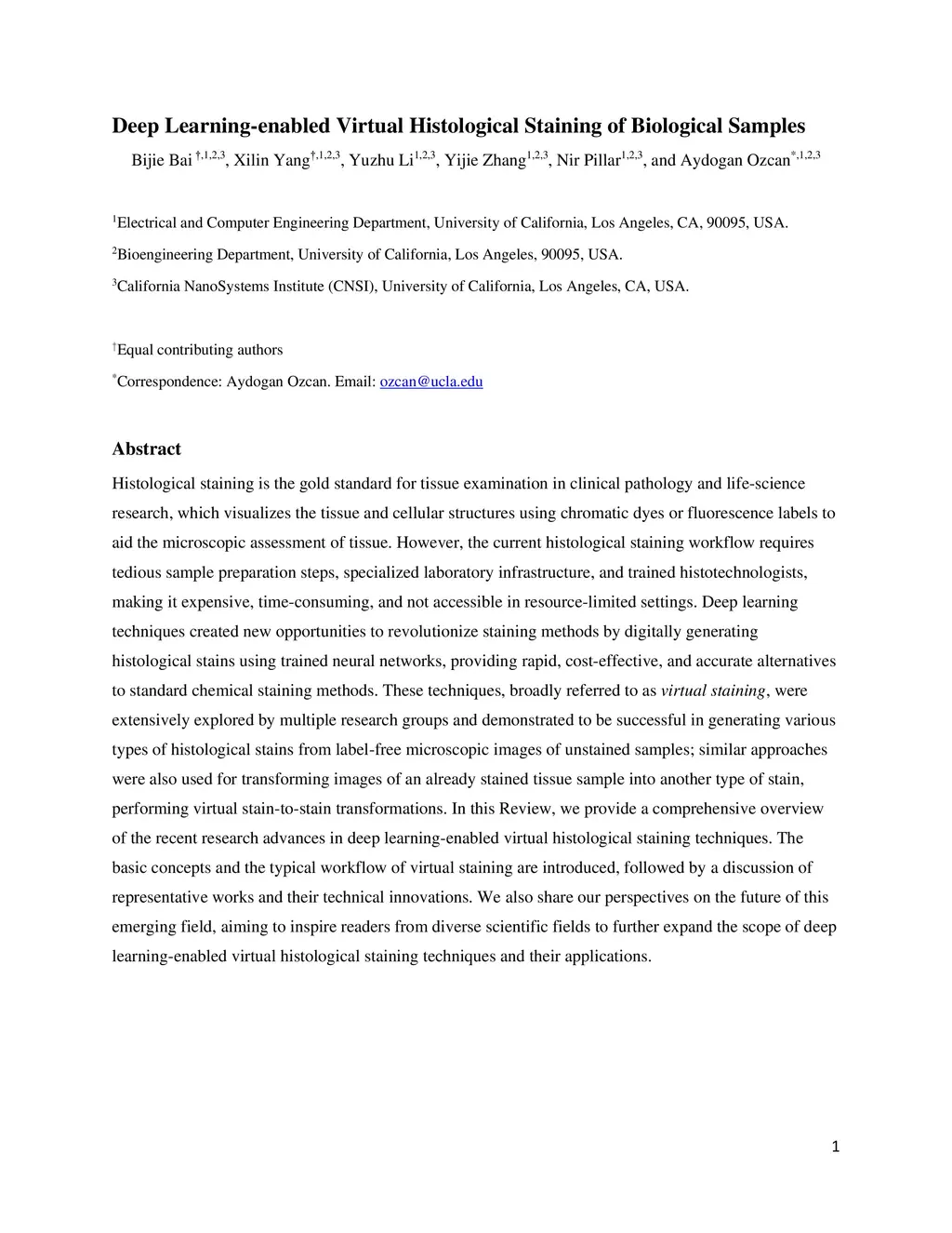 Histological staining is the gold standard for tissue examination in clinical pathology and life-science research, which visualizes the tissue and cellular structures using chromatic dyes or fluorescence labels to aid the microscopic assessment of tissue. However, the current histological staining workflow requires tedious sample preparation steps, specialized laboratory infrastructure, and trained histotechnologists, making it expensive, time-consuming, and not accessible in resource-limited settings. Deep learning techniques created new opportunities to revolutionize staining methods by digitally generating histological stains using trained neural networks, providing rapid, cost-effective, and accurate alternatives to standard chemical staining methods. These techniques, broadly referred to as virtual staining, were extensively explored by multiple research groups and demonstrated to be successful in generating various types of histological stains from label-free microscopic images of unstained samples; similar approaches were also used for transforming images of an already stained tissue sample into another type of stain, performing virtual stain-to-stain transformations. In this Review, we provide a comprehensive overview of the recent research advances in deep learning-enabled virtual histological staining techniques. The basic concepts and the typical workflow of virtual staining are introduced, followed by a discussion of representative works and their technical innovations. We also share our perspectives on the future of this emerging field, aiming to inspire readers from diverse scientific fields to further expand the scope of deep learning-enabled virtual histological staining techniques and their applications.
