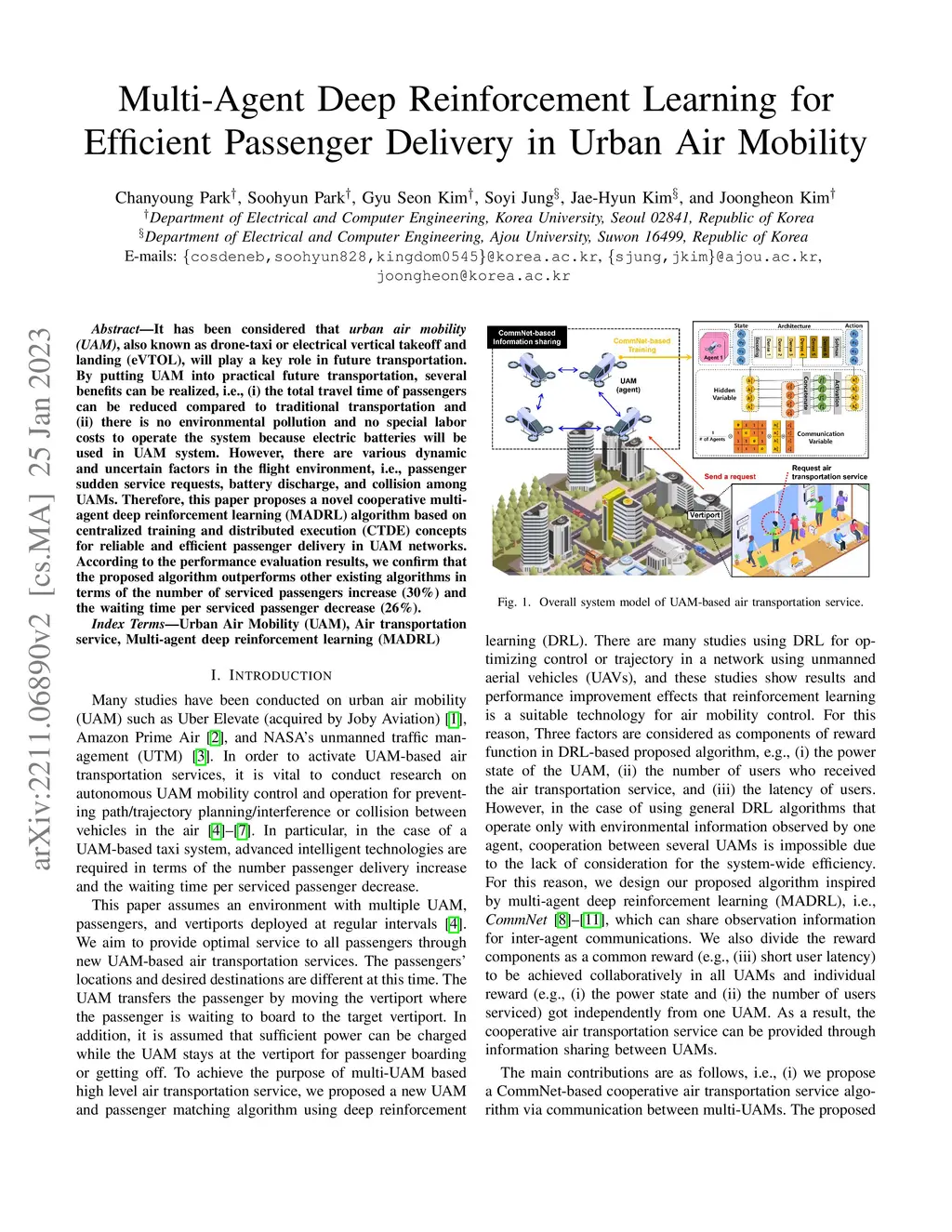 It has been considered that urban air mobility (UAM), also known as drone-taxi or electrical vertical takeoff and landing (eVTOL), will play a key role in future transportation. By putting UAM into practical future transportation, several benefits can be realized, i.e., (i) the total travel time of passengers can be reduced compared to traditional transportation and (ii) there is no environmental pollution and no special labor costs to operate the system because electric batteries will be used in UAM system. However, there are various dynamic and uncertain factors in the flight environment, i.e., passenger sudden service requests, battery discharge, and collision among UAMs. Therefore, this paper proposes a novel cooperative MADRL algorithm based on centralized training and distributed execution (CTDE) concepts for reliable and efficient passenger delivery in UAM networks. According to the performance evaluation results, we confirm that the proposed algorithm outperforms other existing algorithms in terms of the number of serviced passengers increase (30%) and the waiting time per serviced passenger decrease (26%).