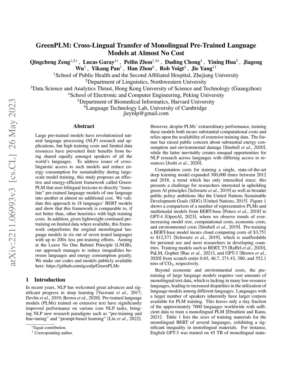 Large pre-trained models have revolutionized natural language processing (NLP) research and applications, but high training costs and limited data resources have prevented their benefits from being shared equally amongst speakers of all the world's languages. To address issues of cross-linguistic access to such models and reduce energy consumption for sustainability during large-scale model training, this study proposes an effective and energy-efficient framework called GreenPLM that uses bilingual lexicons to directly "translate" pre-trained language models of one language into another at almost no additional cost. We validate this approach in 18 languages' BERT models and show that this framework is comparable to, if not better than, other heuristics with high training costs. In addition, given lightweight continued pre-training on limited data where available, this framework outperforms the original monolingual language models in six out of seven tested languages with up to 200x less pre-training efforts. Aiming at the Leave No One Behind Principle (LNOB), our approach manages to reduce inequalities between languages and energy consumption greatly. We make our codes and models publicly available here: \url{https://github.com/qcznlp/GreenPLMs}