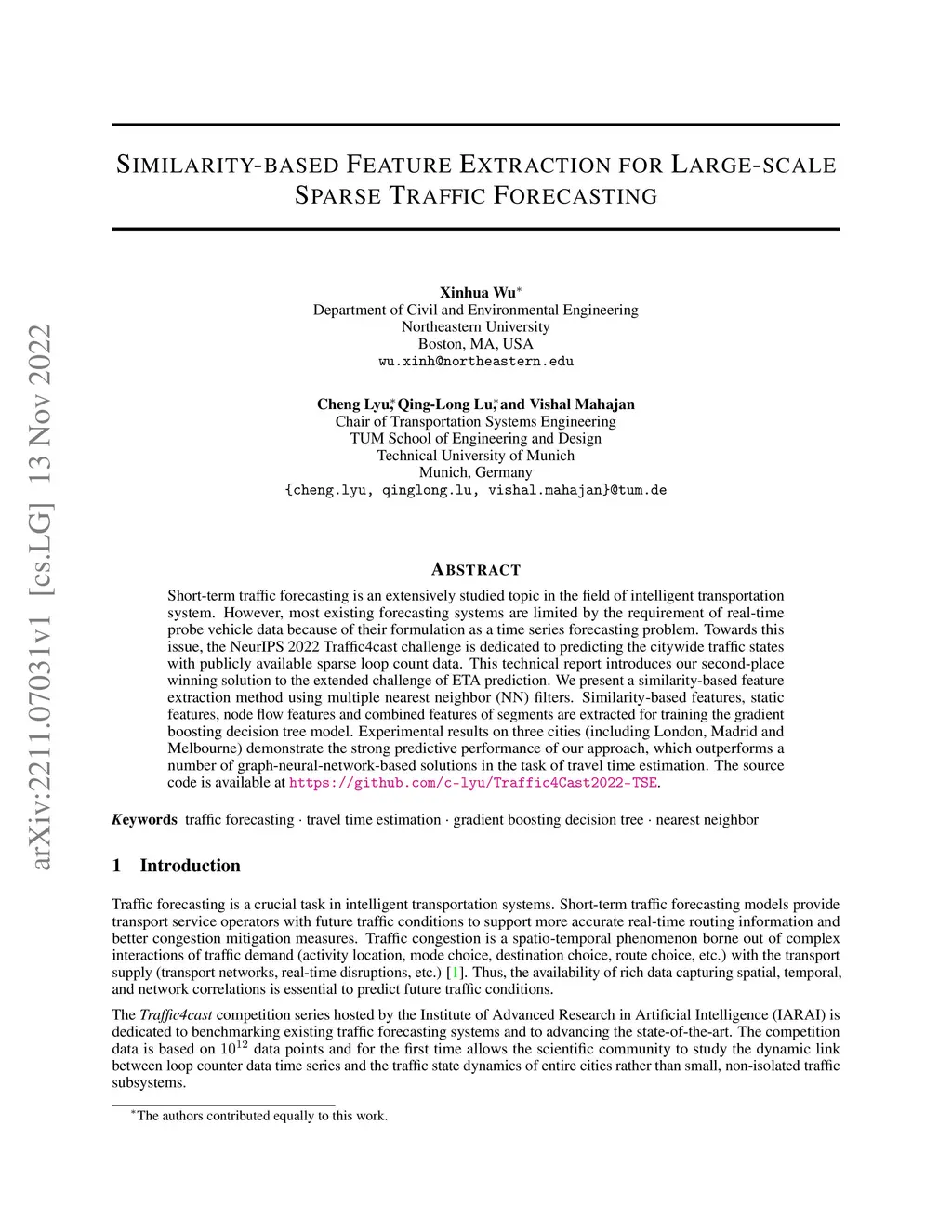 Short-term traffic forecasting is an extensively studied topic in the field of intelligent transportation system. However, most existing forecasting systems are limited by the requirement of real-time probe vehicle data because of their formulation as a time series forecasting problem. Towards this issue, the NeurIPS 2022 Traffic4cast challenge is dedicated to predicting the citywide traffic states with publicly available sparse loop count data. This technical report introduces our second-place winning solution to the extended challenge of ETA prediction. We present a similarity-based feature extraction method using multiple nearest neighbor (NN) filters. Similarity-based features, static features, node flow features and combined features of segments are extracted for training the gradient boosting decision tree model. Experimental results on three cities (including London, Madrid and Melbourne) demonstrate the strong predictive performance of our approach, which outperforms a number of graph-neural-network-based solutions in the task of travel time estimation. The source code is available at \url{https://github.com/c-lyu/Traffic4Cast2022-TSE}.