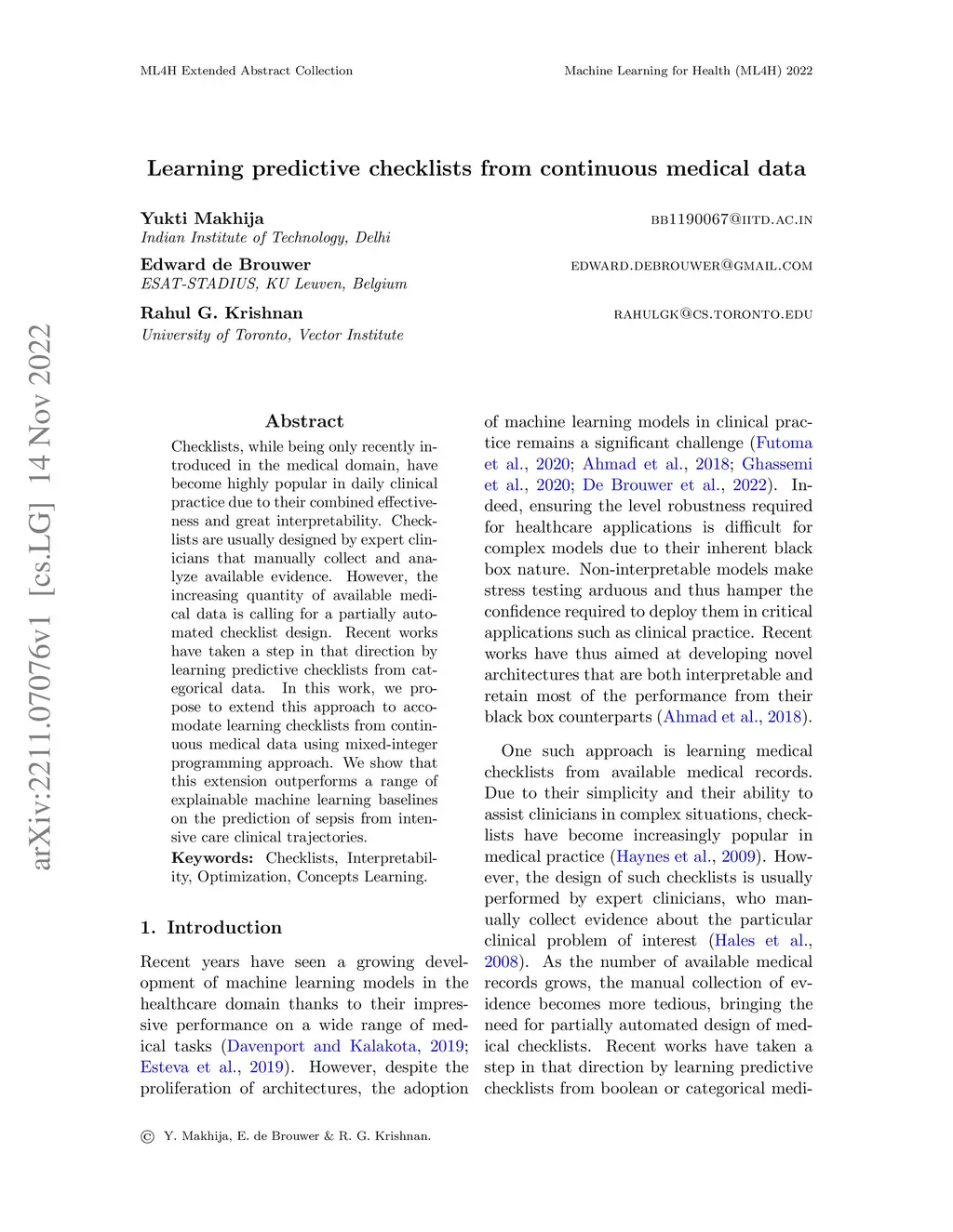 Checklists, while being only recently introduced in the medical domain, have become highly popular in daily clinical practice due to their combined effectiveness and great interpretability. Checklists are usually designed by expert clinicians that manually collect and analyze available evidence. However, the increasing quantity of available medical data is calling for a partially automated checklist design. Recent works have taken a step in that direction by learning predictive checklists from categorical data. In this work, we propose to extend this approach to accomodate learning checklists from continuous medical data using mixed-integer programming approach. We show that this extension outperforms a range of explainable machine learning baselines on the prediction of sepsis from intensive care clinical trajectories.