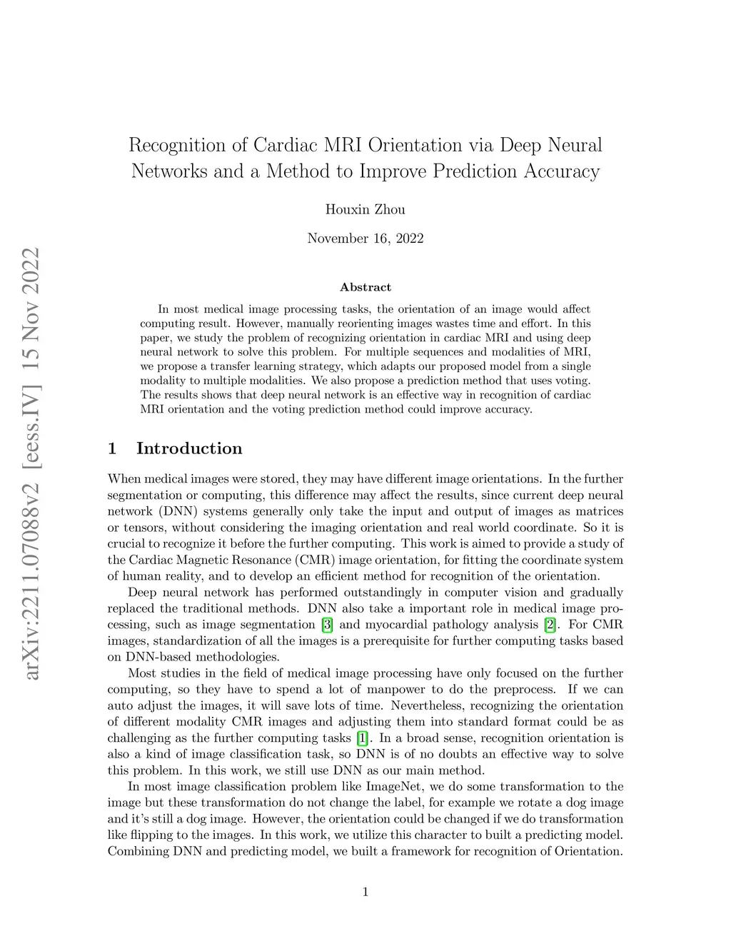 Recognition of Cardiac MRI Orientation via Deep Neural Networks and a