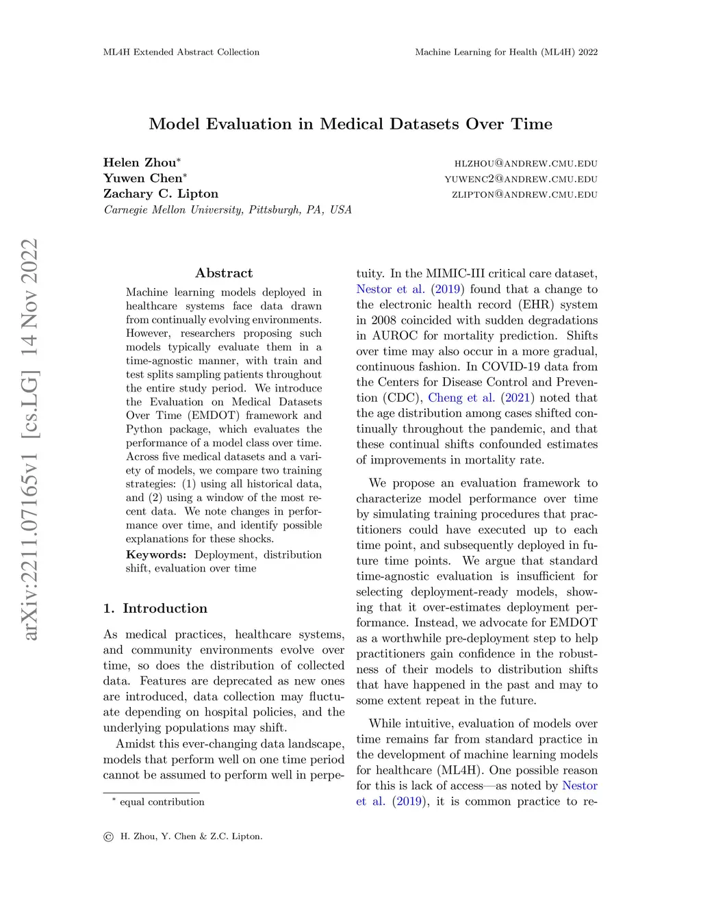 Machine learning models deployed in healthcare systems face data drawn from continually evolving environments. However, researchers proposing such models typically evaluate them in a time-agnostic manner, with train and test splits sampling patients throughout the entire study period. We introduce the Evaluation on Medical Datasets Over Time (EMDOT) framework and Python package, which evaluates the performance of a model class over time. Across five medical datasets and a variety of models, we compare two training strategies: (1) using all historical data, and (2) using a window of the most recent data. We note changes in performance over time, and identify possible explanations for these shocks.