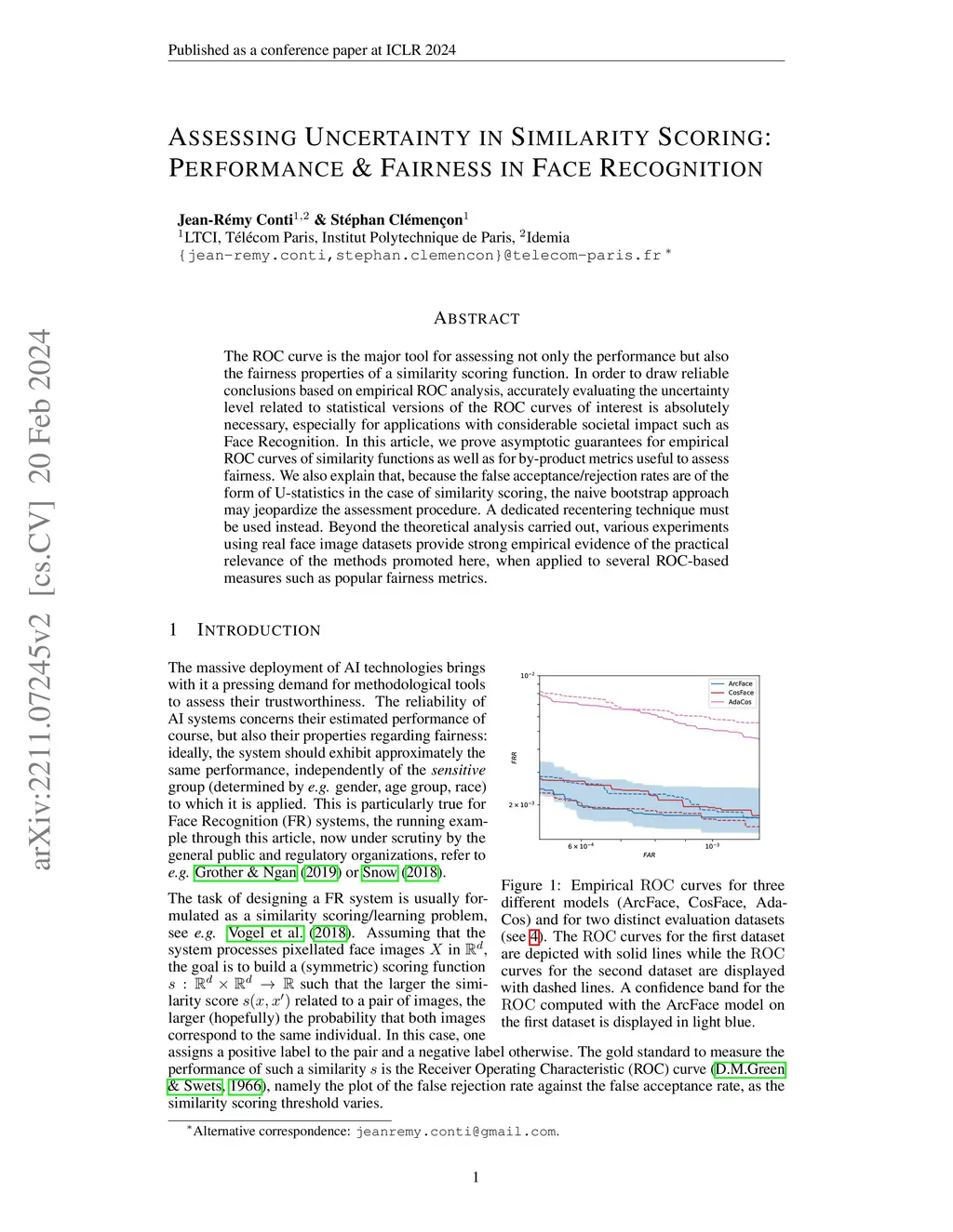 The ROC curve is the major tool for assessing not only the performance but also the fairness properties of a similarity scoring function. In order to draw reliable conclusions based on empirical ROC analysis, accurately evaluating the uncertainty level related to statistical versions of the ROC curves of interest is absolutely necessary, especially for applications with considerable societal impact such as Face Recognition. In this article, we prove asymptotic guarantees for empirical ROC curves of similarity functions as well as for by-product metrics useful to assess fairness. We also explain that, because the false acceptance/rejection rates are of the form of U-statistics in the case of similarity scoring, the naive bootstrap approach may jeopardize the assessment procedure. A dedicated recentering technique must be used instead. Beyond the theoretical analysis carried out, various experiments using real face image datasets provide strong empirical evidence of the practical relevance of the methods promoted here, when applied to several ROC-based measures such as popular fairness metrics.