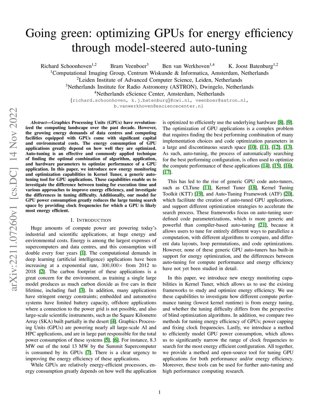 Graphics Processing Units (GPUs) have revolutionized the computing landscape over the past decade. However, the growing energy demands of data centres and computing facilities equipped with GPUs come with significant capital and environmental costs. The energy consumption of GPU applications greatly depend on how well they are optimized. Auto-tuning is an effective and commonly applied technique of finding the optimal combination of algorithm, application, and hardware parameters to optimize performance of a GPU application. In this paper, we introduce new energy monitoring and optimization capabilities in Kernel Tuner, a generic auto-tuning tool for GPU applications. These capabilities enable us to investigate the difference between tuning for execution time and various approaches to improve energy efficiency, and investigate the differences in tuning difficulty. Additionally, our model for GPU power consumption greatly reduces the large tuning search space by providing clock frequencies for which a GPU is likely most energy efficient.