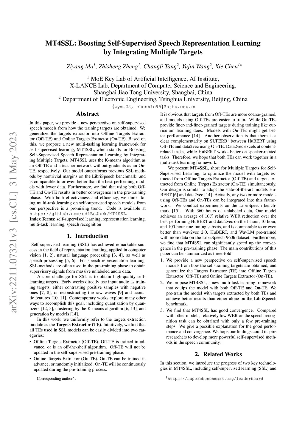 In this paper, we provide a new perspective on self-supervised speech models from how the training targets are obtained. We generalize the targets extractor into Offline Targets Extractor (Off-TE) and Online Targets Extractor (On-TE). Based on this, we propose a new multi-tasking learning framework for self-supervised learning, MT4SSL, which stands for Boosting Self-Supervised Speech Representation Learning by Integrating Multiple Targets. MT4SSL uses the K-means algorithm as an Off-TE and a teacher network without gradients as an On-TE, respectively. Our model outperforms previous SSL methods by nontrivial margins on the LibriSpeech benchmark, and is comparable to or even better than the best-performing models with fewer data. Furthermore, we find that using both Off-TE and On-TE results in better convergence in the pre-training phase. With both effectiveness and efficiency, we think doing multi-task learning on self-supervised speech models from our perspective is a promising trend.