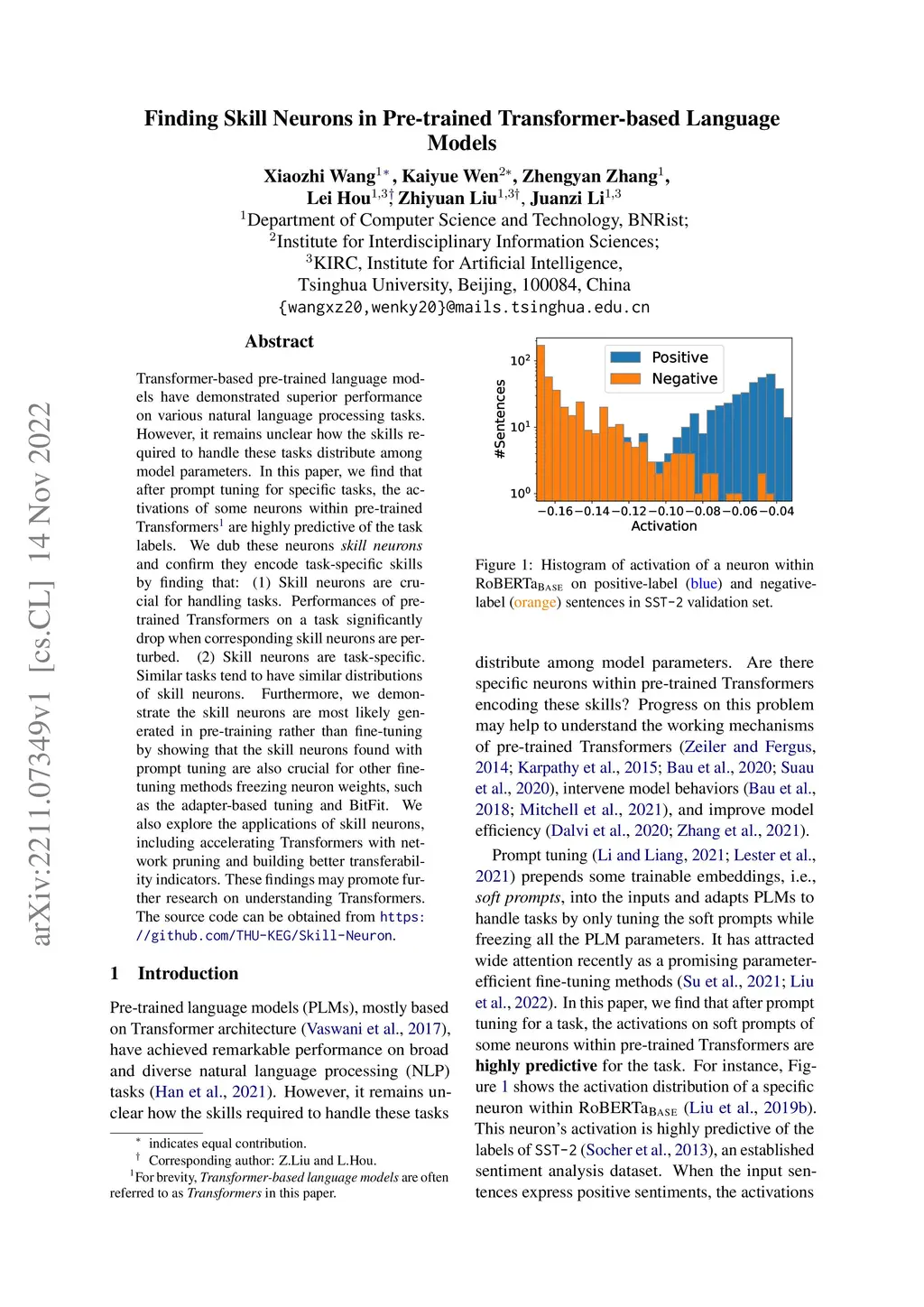 Transformer-based pre-trained language models have demonstrated superior performance on various natural language processing tasks. However, it remains unclear how the skills required to handle these tasks distribute among model parameters. In this paper, we find that after prompt tuning for specific tasks, the activations of some neurons within pre-trained Transformers are highly predictive of the task labels. We dub these neurons skill neurons and confirm they encode task-specific skills by finding that: (1) Skill neurons are crucial for handling tasks. Performances of pre-trained Transformers on a task significantly drop when corresponding skill neurons are perturbed. (2) Skill neurons are task-specific. Similar tasks tend to have similar distributions of skill neurons. Furthermore, we demonstrate the skill neurons are most likely generated in pre-training rather than fine-tuning by showing that the skill neurons found with prompt tuning are also crucial for other fine-tuning methods freezing neuron weights, such as the adapter-based tuning and BitFit. We also explore the applications of skill neurons, including accelerating Transformers with network pruning and building better transferability indicators. These findings may promote further research on understanding Transformers. The source code can be obtained from https://github.com/THU-KEG/Skill-Neuron.