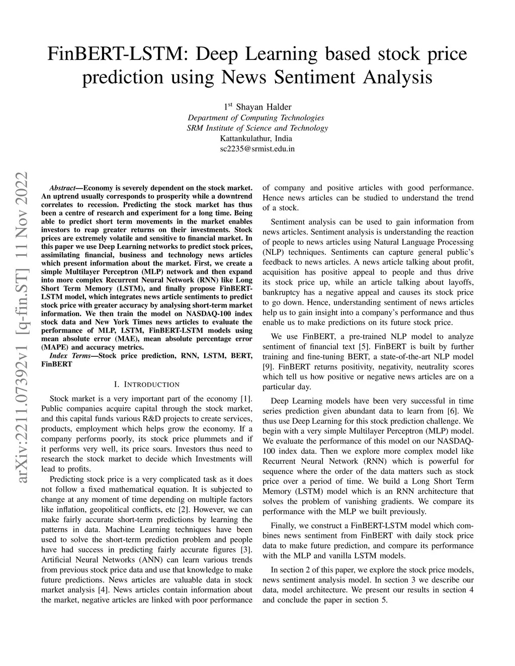 Economy is severely dependent on the stock market. An uptrend usually corresponds to prosperity while a downtrend correlates to recession. Predicting the stock market has thus been a centre of research and experiment for a long time. Being able to predict short term movements in the market enables investors to reap greater returns on their investments. Stock prices are extremely volatile and sensitive to financial market. In this paper we use Deep Learning networks to predict stock prices, assimilating financial, business and technology news articles which present information about the market. First, we create a simple Multilayer Perceptron (MLP) network and then expand into more complex Recurrent Neural Network (RNN) like Long Short Term Memory (LSTM), and finally propose FinBERT-LSTM model, which integrates news article sentiments to predict stock price with greater accuracy by analysing short-term market information. We then train the model on NASDAQ-100 index stock data and New York Times news articles to evaluate the performance of MLP, LSTM, FinBERT-LSTM models using mean absolute error (MAE), mean absolute percentage error (MAPE) and accuracy metrics.