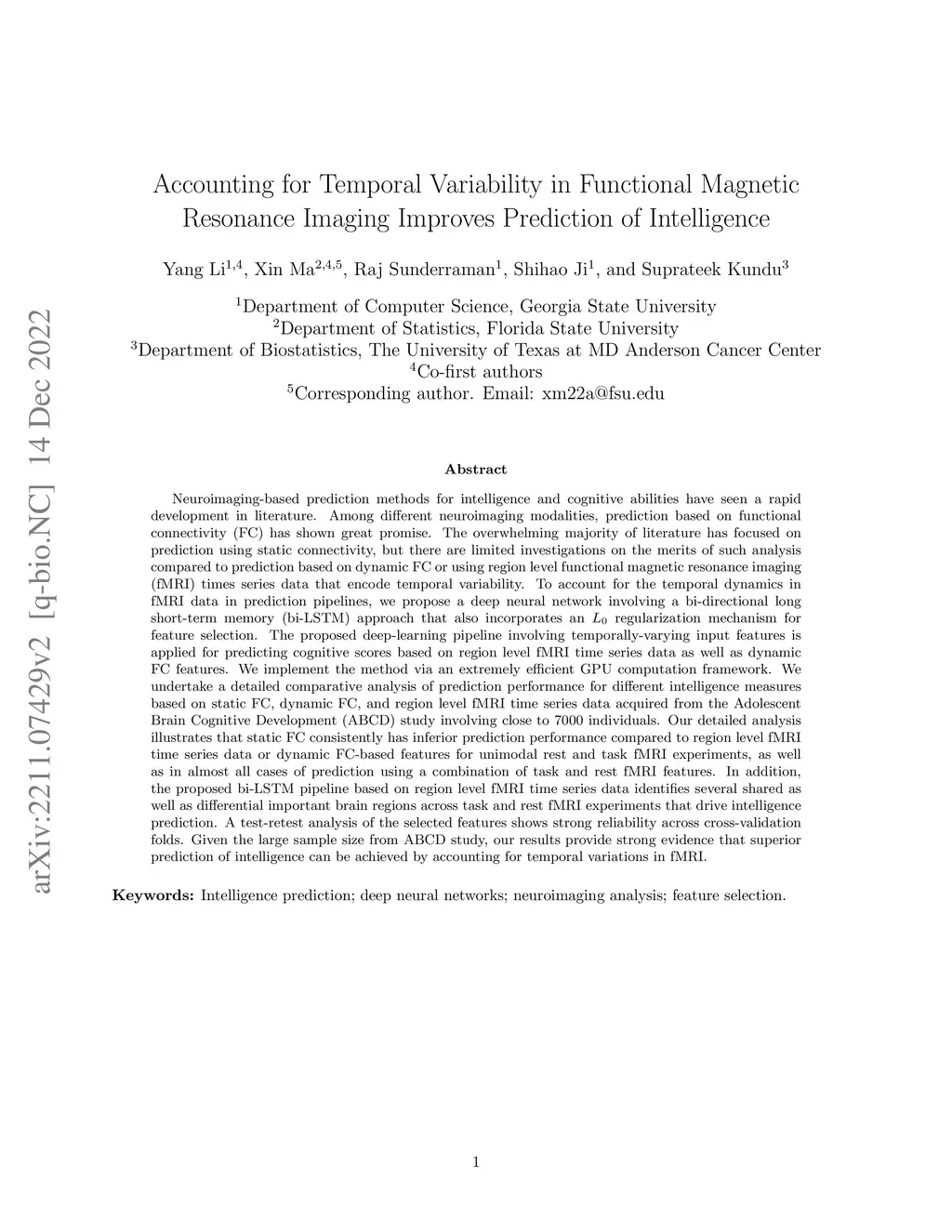 Neuroimaging-based prediction methods for intelligence and cognitive abilities have seen a rapid development in literature. Among different neuroimaging modalities, prediction based on functional connectivity (FC) has shown great promise. Most literature has focused on prediction using static FC, but there are limited investigations on the merits of such analysis compared to prediction based on dynamic FC or region level functional magnetic resonance imaging (fMRI) times series that encode temporal variability. To account for the temporal dynamics in fMRI data, we propose a deep neural network involving bi-directional long short-term memory (bi-LSTM) approach that also incorporates feature selection mechanism. The proposed pipeline is implemented via an efficient GPU computation framework and applied to predict intelligence scores based on region level fMRI time series as well as dynamic FC. We compare the prediction performance for different intelligence measures based on static FC, dynamic FC, and region level time series acquired from the Adolescent Brain Cognitive Development (ABCD) study involving close to 7000 individuals. Our detailed analysis illustrates that static FC consistently has inferior prediction performance compared to region level time series or dynamic FC for unimodal rest and task fMRI experiments, and in almost all cases using a combination of task and rest features. In addition, the proposed bi-LSTM pipeline based on region level time series identifies several shared and differential important brain regions across task and rest fMRI experiments that drive intelligence prediction. A test-retest analysis of the selected features shows strong reliability across cross-validation folds. Given the large sample size from ABCD study, our results provide strong evidence that superior prediction of intelligence can be achieved by accounting for temporal variations in fMRI.